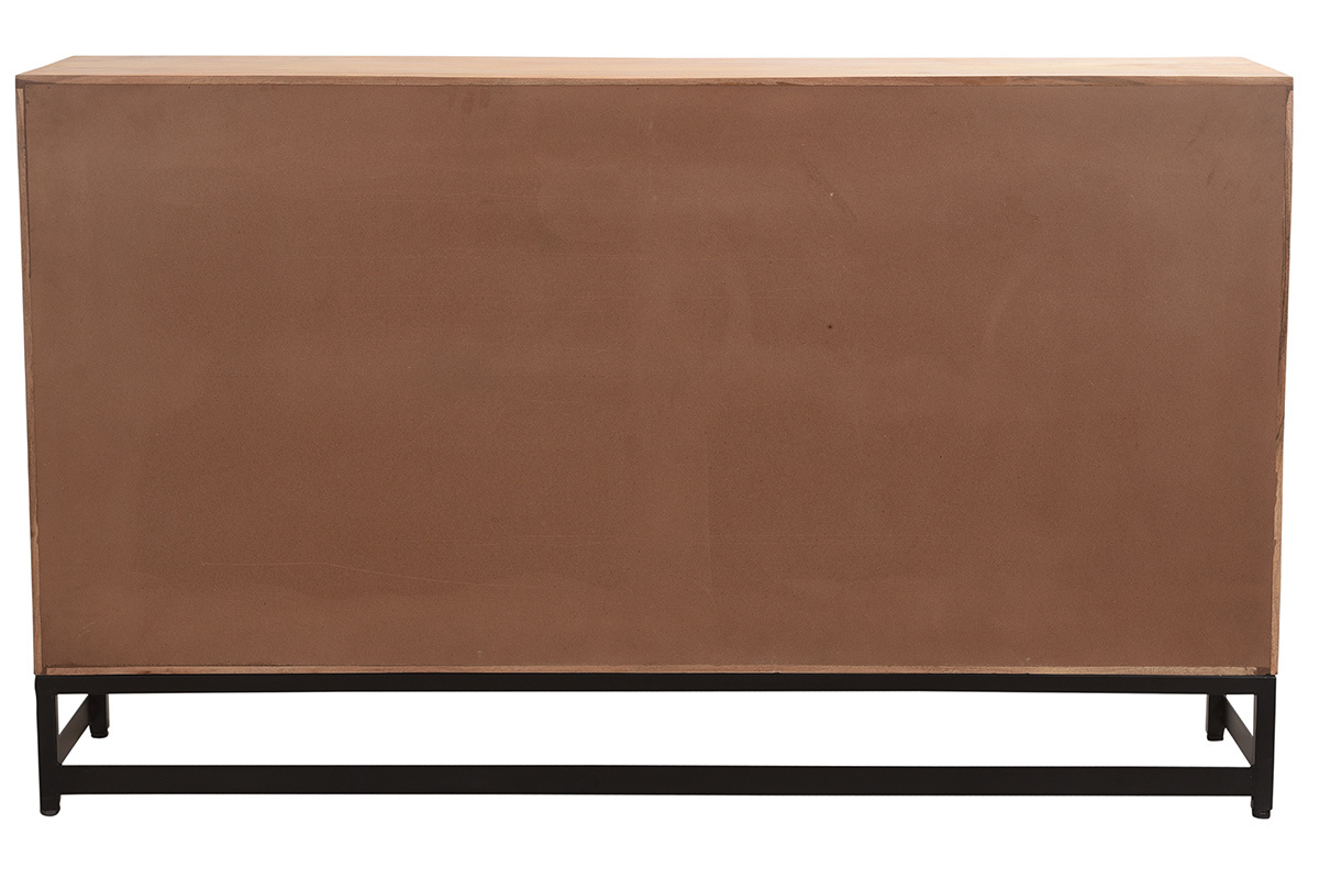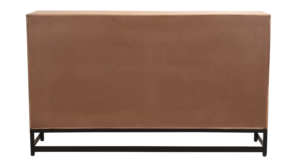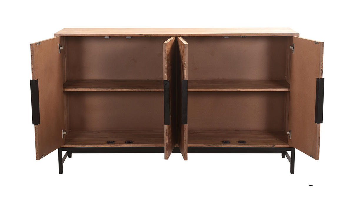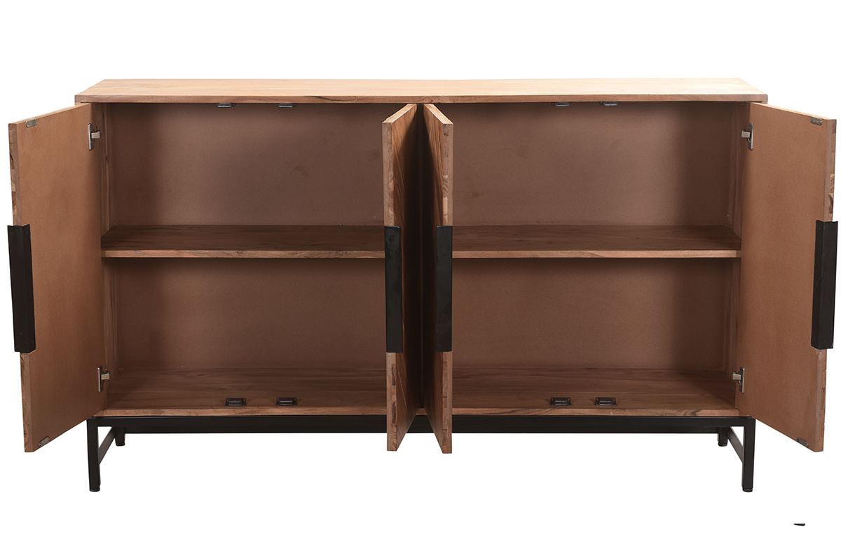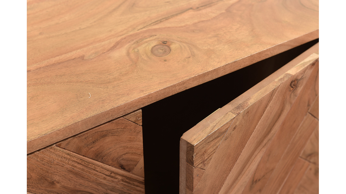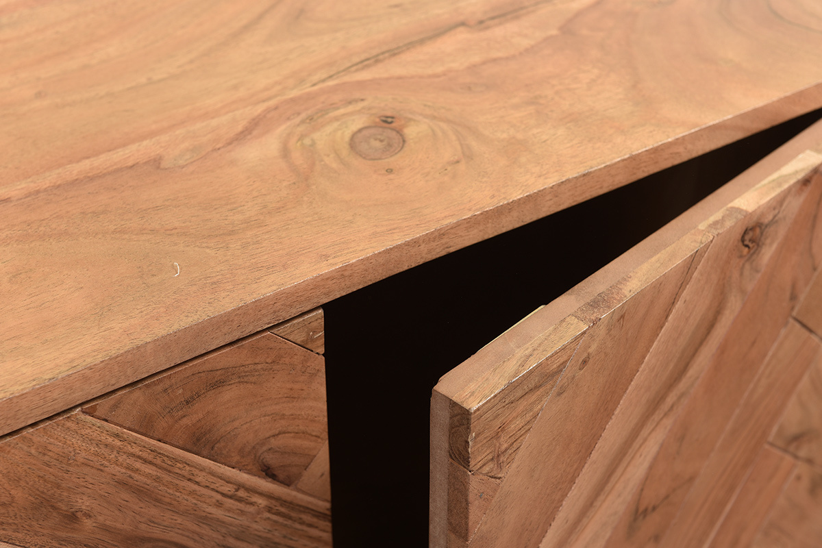 Ce buffet 4 portes est un meuble authentique. Il a été conçu selon des techniques artisanales. C'est ce rendu "fait main" associé au motif moderne des portes qui fait tout le charme de ce meuble. L'acacia qui le compose est un bois aux tons légèrement rouges - une essence exotique a été spécialement choisi pour ses nuances singulières. Marié avec un piètement métallique noir travaillé tout en finesse, il offre un rendu brut intemporel.