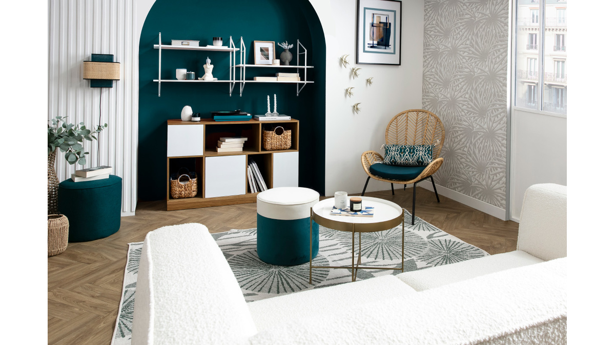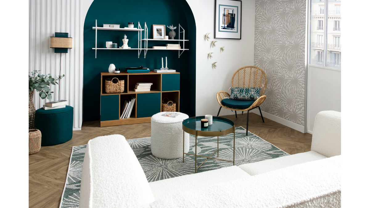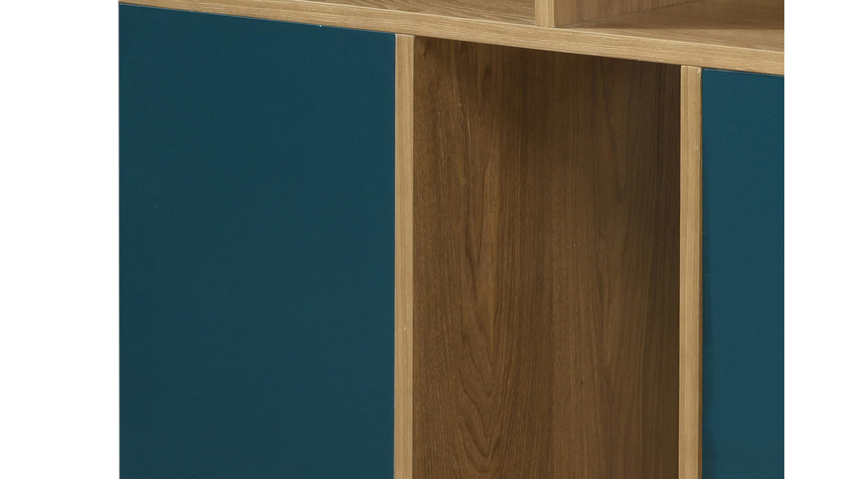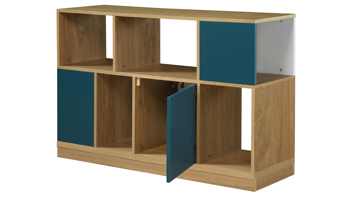 Le meuble de rangement JODIE ne manque pas de personnalité ! D'un côté, ce buffet affiche un style scandinave élégant et épuré ; de l'autre, c'est une pièce haute en couleur et pleine de vitalité. Séparer un coin bureau ; créer un espace repas dans un séjour... rien de plus simple avec ce petit buffet bas réversible. Avec ses portes bleu canard et blanches, c'est le séparateur d'espace idéal : à chaque coin de la pièce son style ! Les éléments colorés contrastent joliment avec une structure mêlant panneaux de fibres de bois et hévéa massif. Cette création exclusive reprend les codes du design scandinave dans une version moderne et astucieuse.