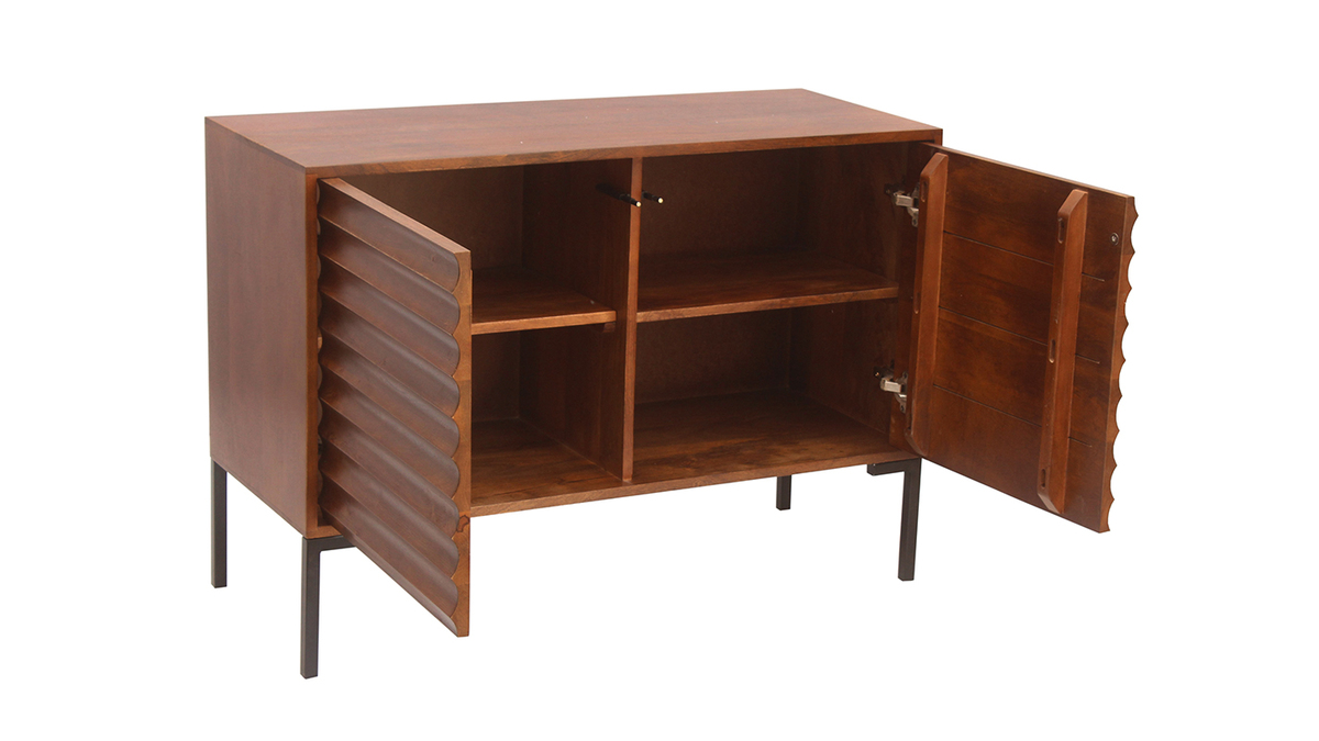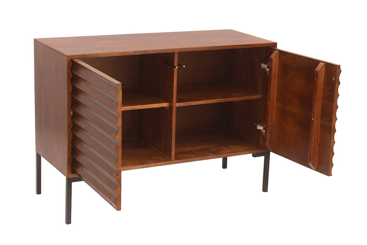 Ce buffet en manguier massif est issu d'un joli travail sur la matière. Ses façades sont sculptées directement dans le bois. Les saillies dessinent des lignes horizontales qui forment un motif répété ultra graphique. Conçu de manière artisanale avec le cachet unique du "fait main", ce buffet en bois foncé se distingue par son caractère à la fois authentique et très contemporain. La patine marron foncé appliquée sur ce meuble de rangement nourrit le bois tout en renforçant un peu plus son rendu chaud et naturel. On adore aussi l'association de ce bois exotique avec le métal utilisé pour le piètement.