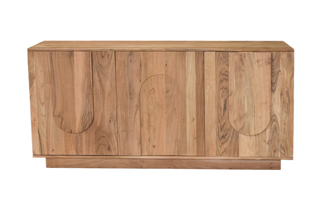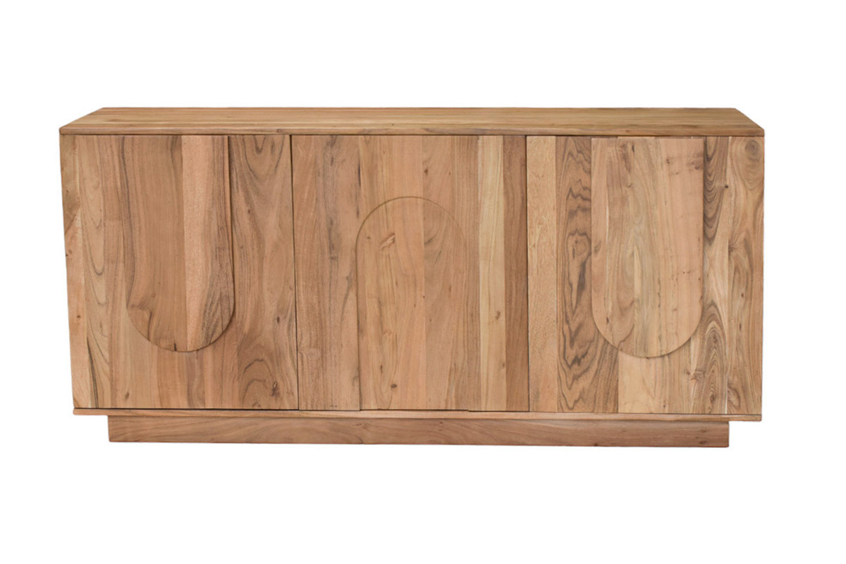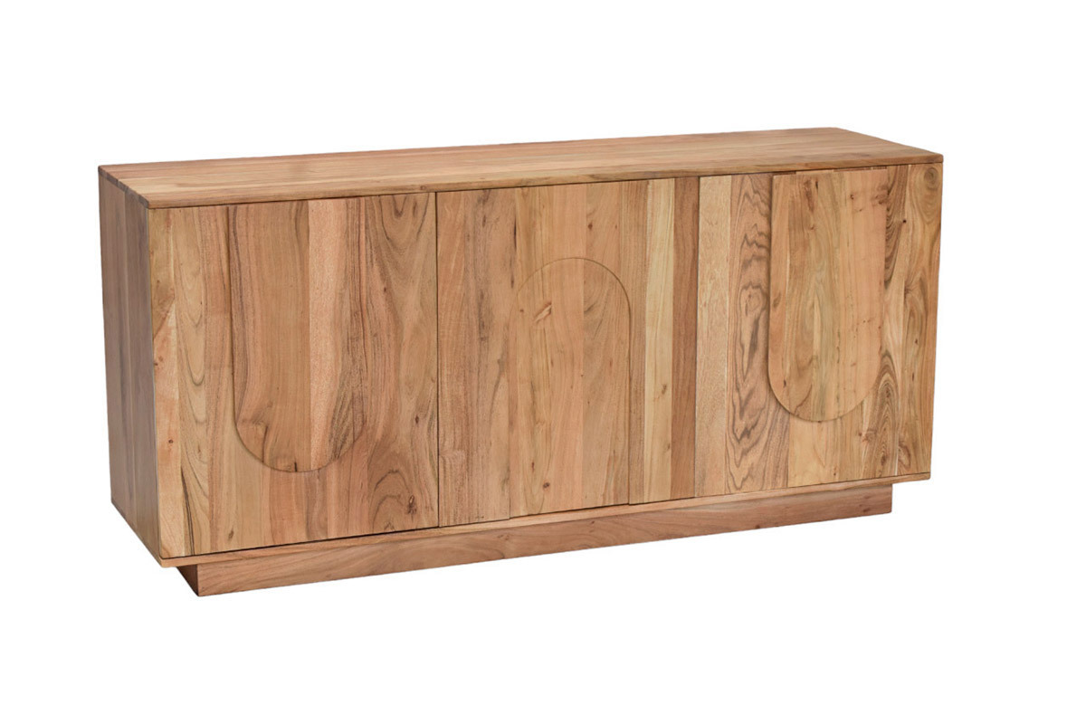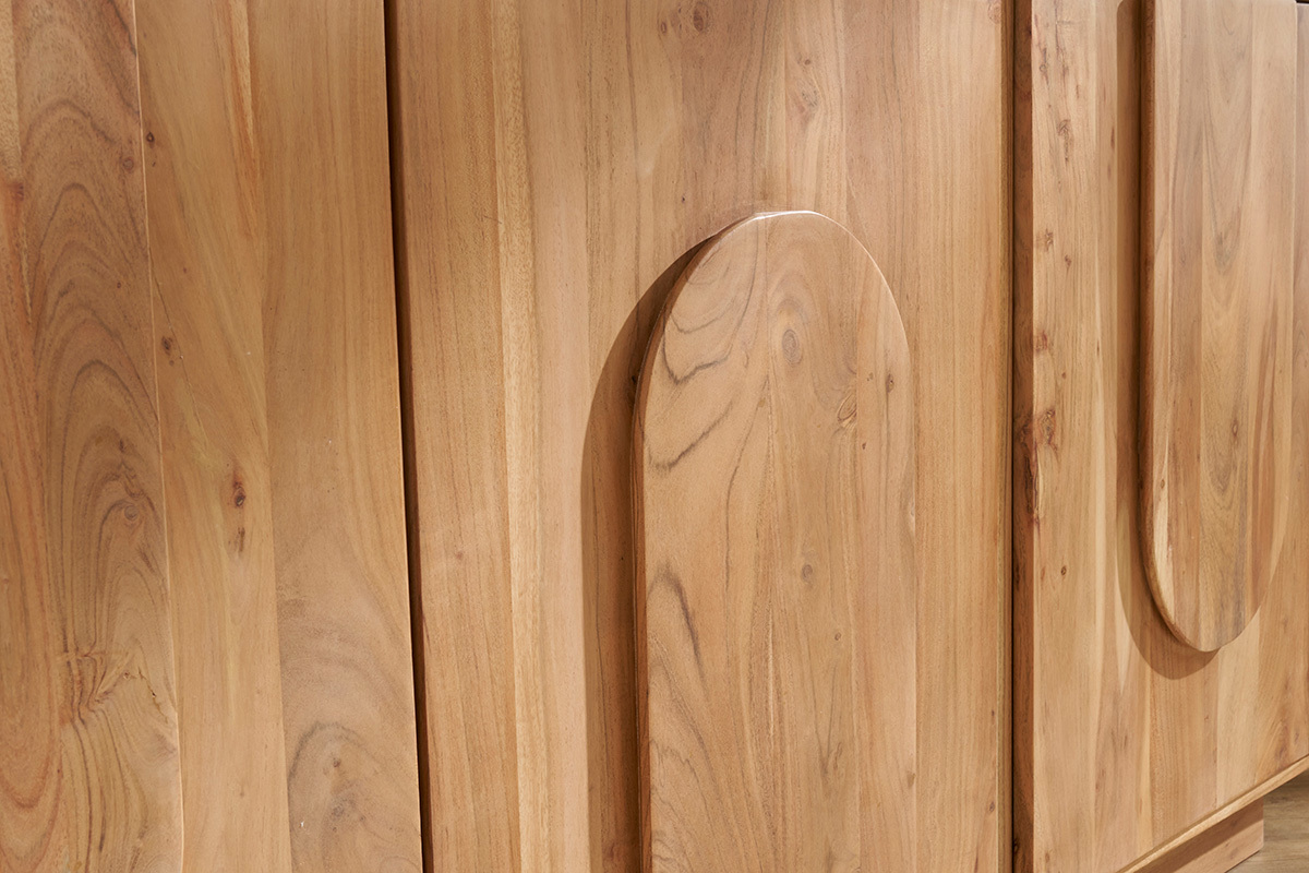On adore la manière par laquelle les arrondis taillés à la main subliment la matière et les volumes de ce grand buffet en bois. Ce relief issu d'un façonnage artisanal met véritablement en valeur la silhouette maximaliste et les reflets chauds de ce buffet moderne ! D'inspiration organique, les formes courbées s'unissent à ravir aux tons mordorés de l'acacia : de quoi rythmer tout en douceur votre intérieur.