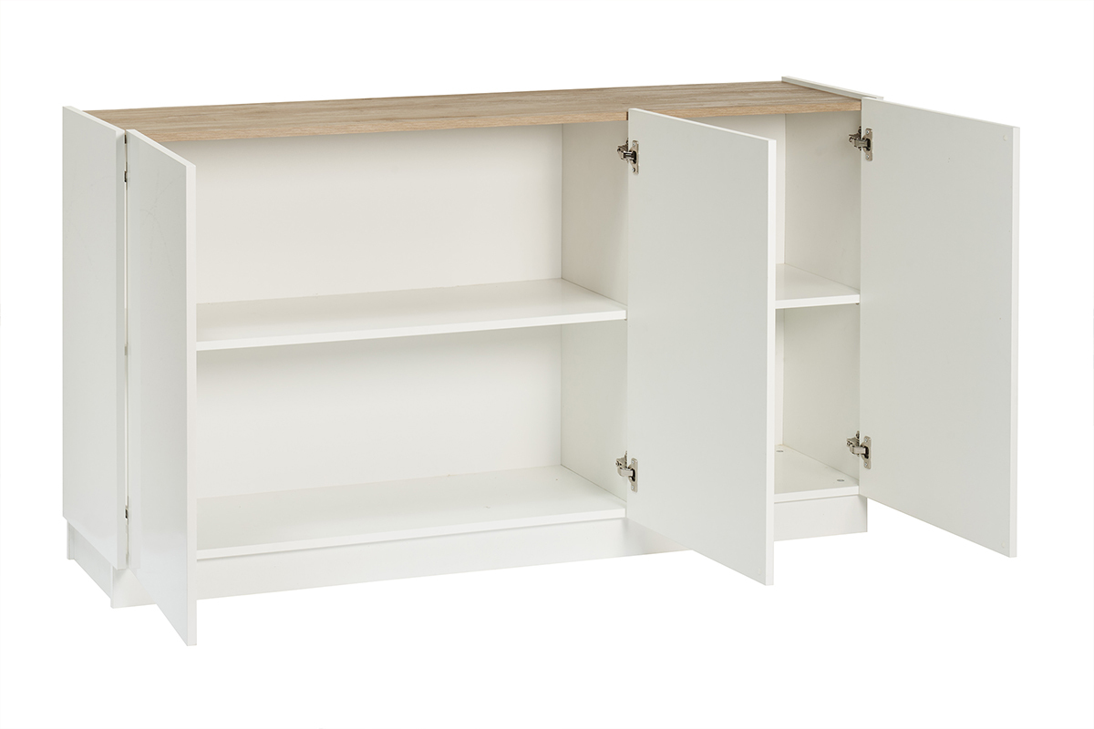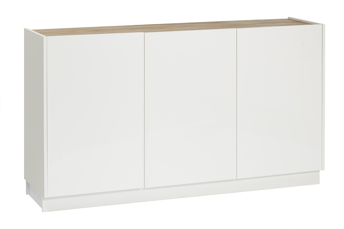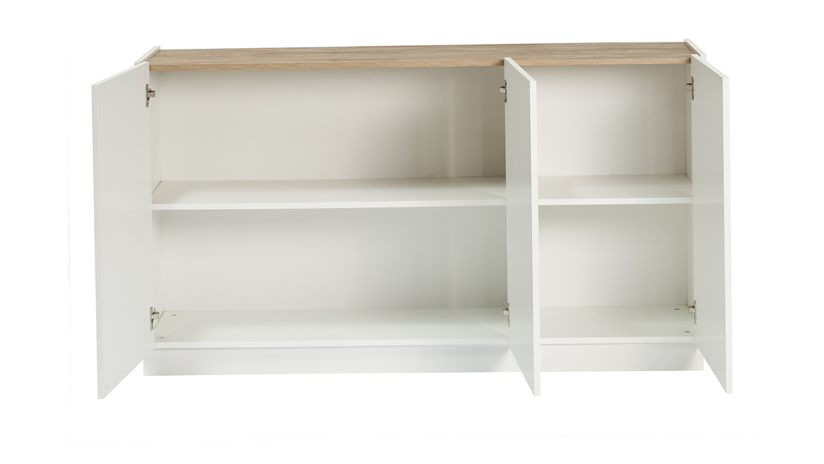 Buffet design blanc laqué brillant et bois clair 3 portes L155 cm NELIO fabriqué en Italie. Livré à monter.