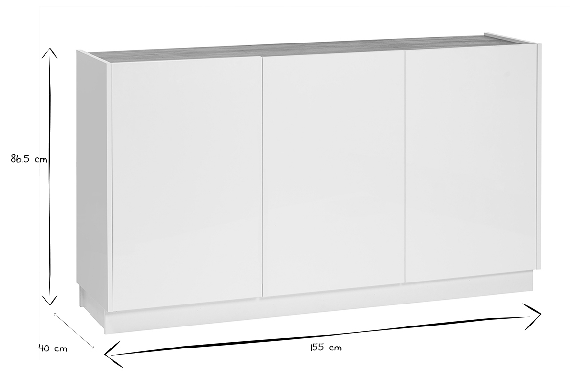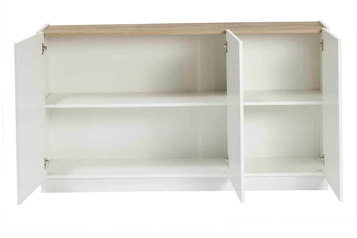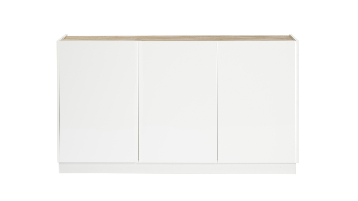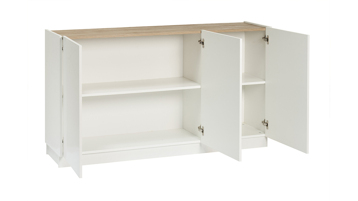 Buffet design blanc laqué brillant et bois clair 3 portes L155 cm NELIO fabriqué en Italie. Livré à monter.