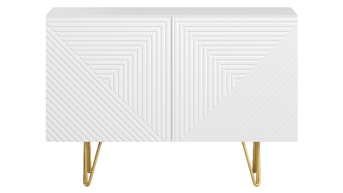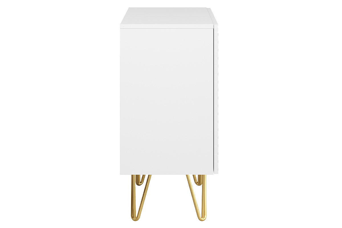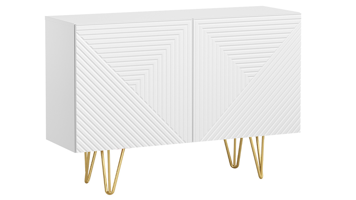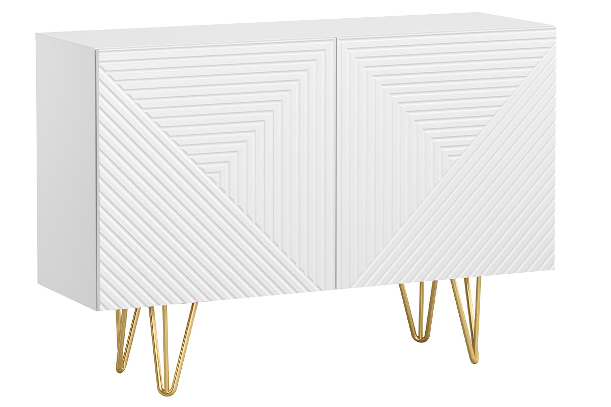 Décoré en façade par un motif chevronné en relief et parti pris d'un design moderne, ce meuble de rangement blanc mat est subtilement surmonté par 4 pieds métalliques doré mat. À l'inspiration vintage, le piètement épingle confère à l'ensemble une silhouette aérienne et épurée. Matières et couleurs forment un délicat duo sans fausse note qui se démarquera autant dans une ambiance déco contemporaine que rétro chic.