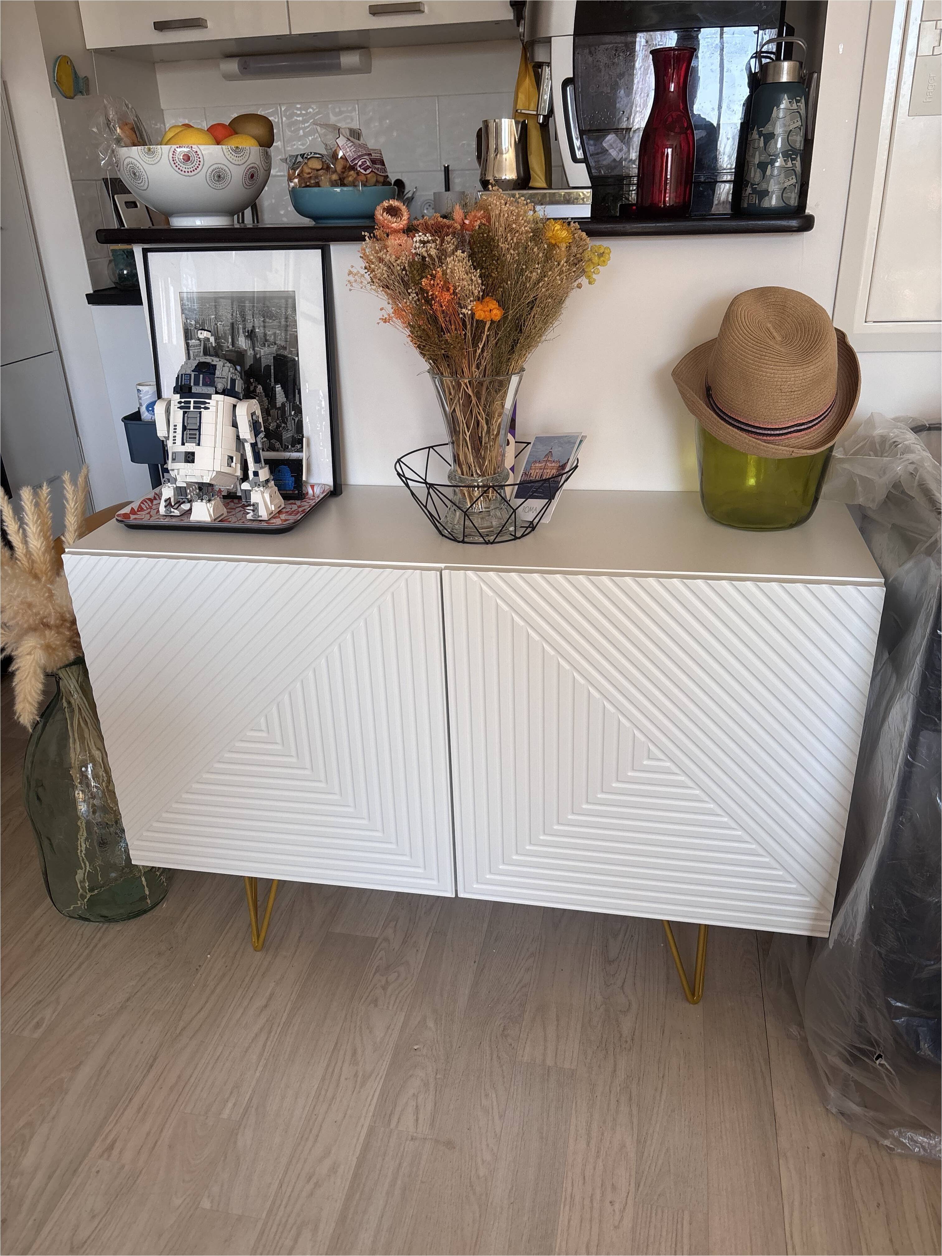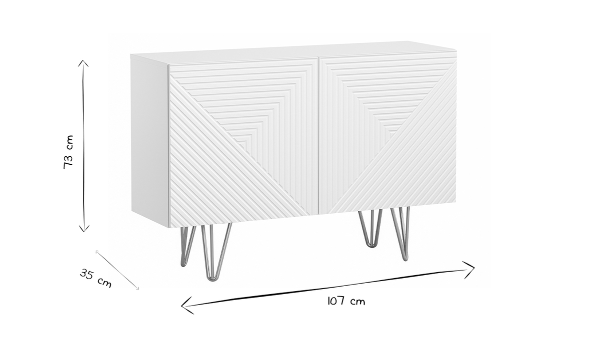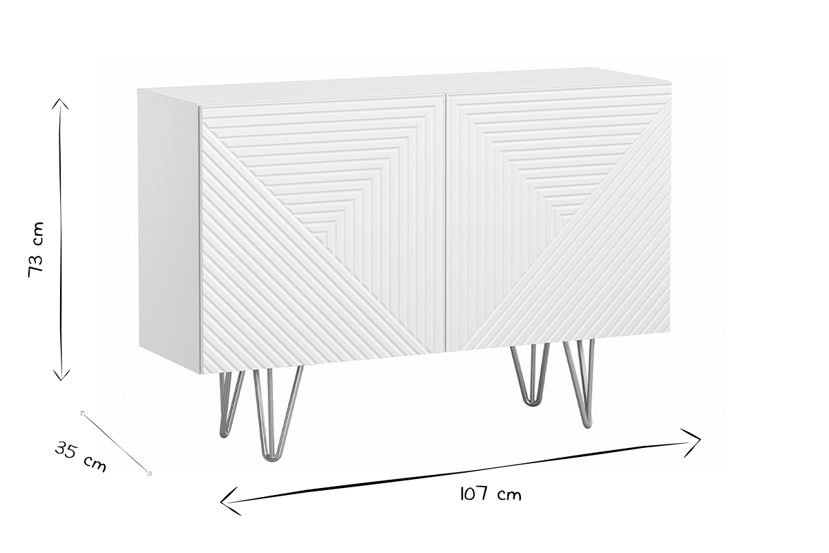 Décoré en façade par un motif chevronné en relief et parti pris d'un design moderne, ce meuble de rangement blanc mat est subtilement surmonté par 4 pieds métalliques doré mat. À l'inspiration vintage, le piètement épingle confère à l'ensemble une silhouette aérienne et épurée. Matières et couleurs forment un délicat duo sans fausse note qui se démarquera autant dans une ambiance déco contemporaine que rétro chic.