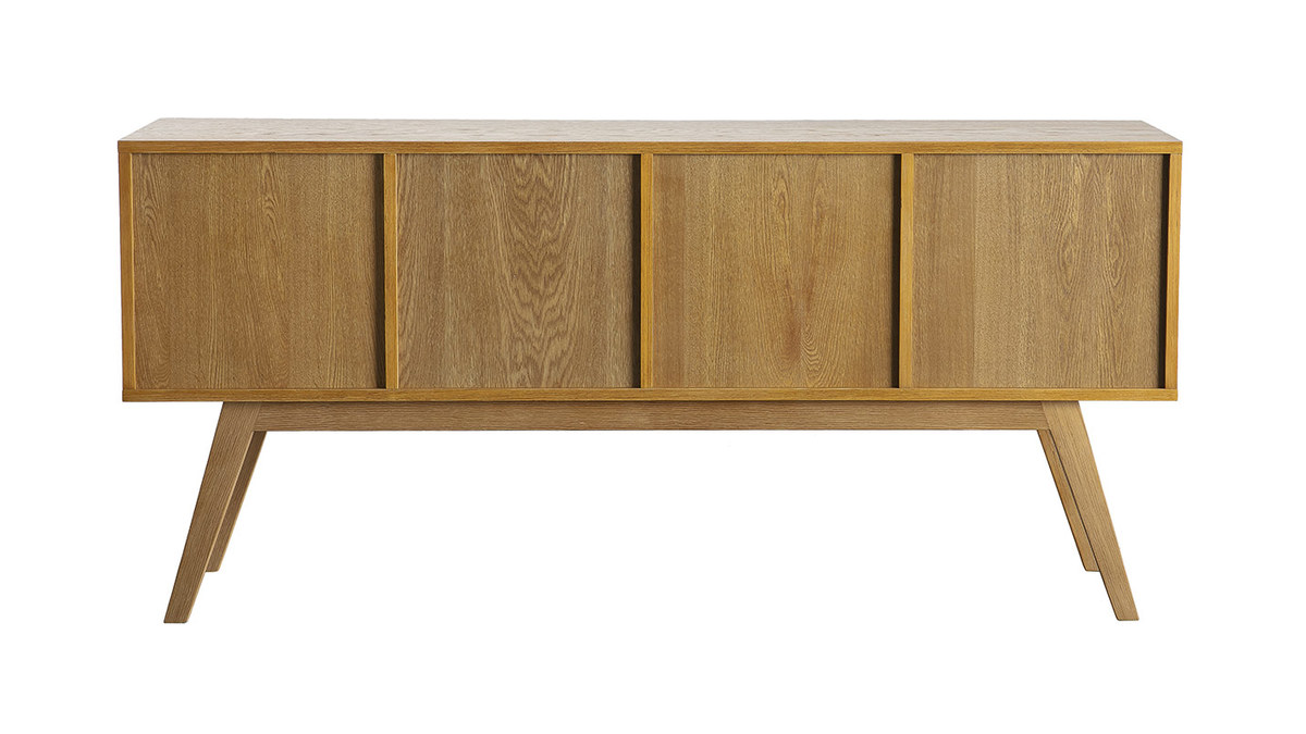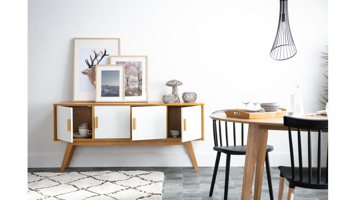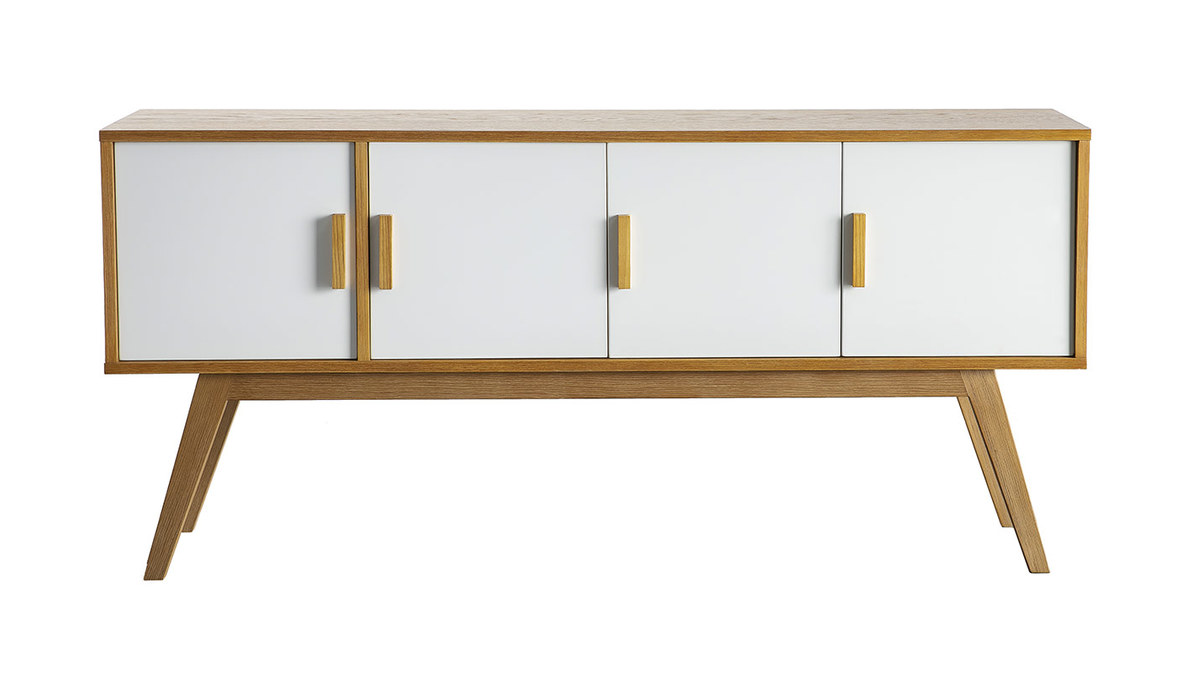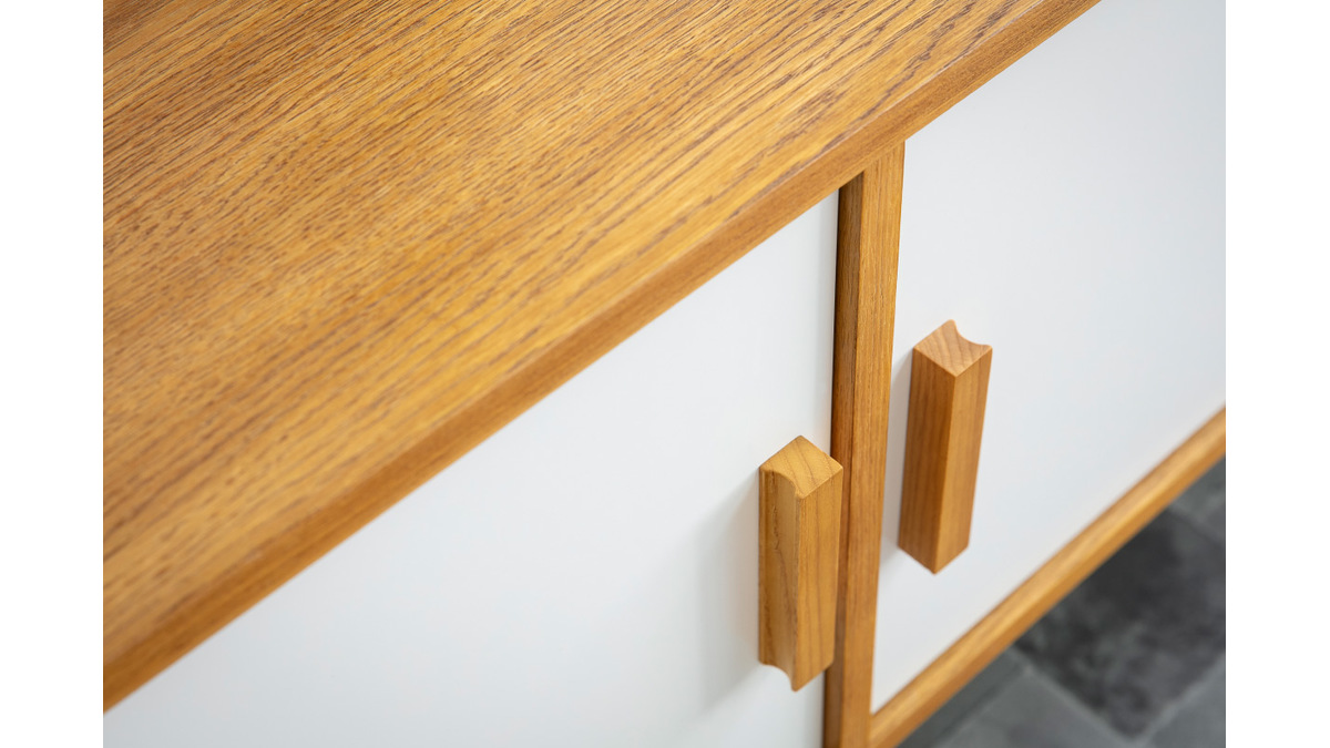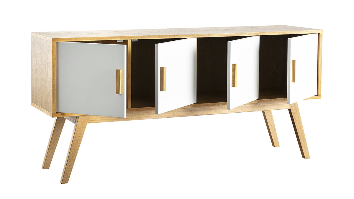 Les poignées et les pieds du buffet design HELIA sont en chêne massif, sa structure en panneaux de fibres de bois plaqué chêne, ses portes sont en panneaux de fibres de bois peint fini mat pour un look simple tout en douceur.
