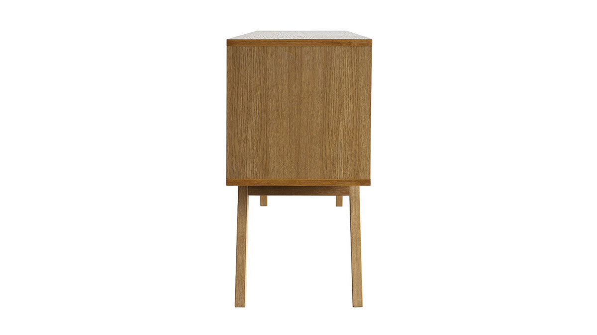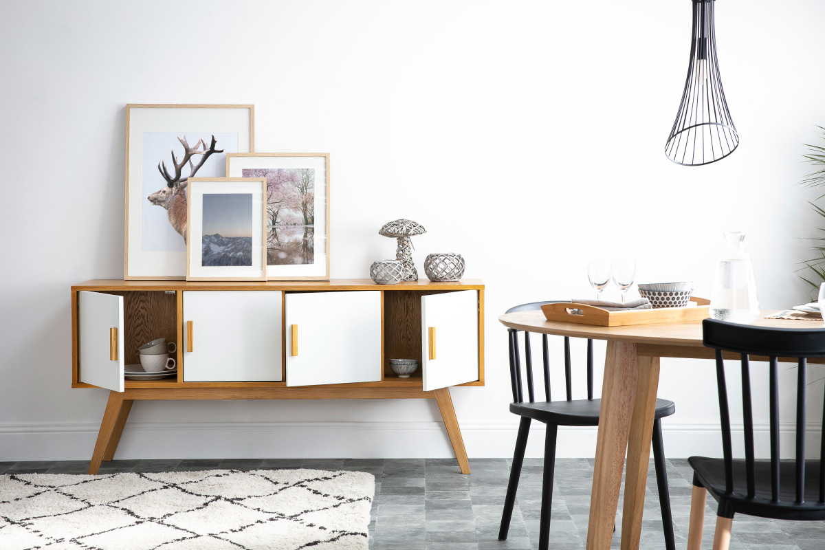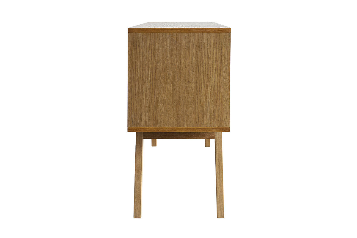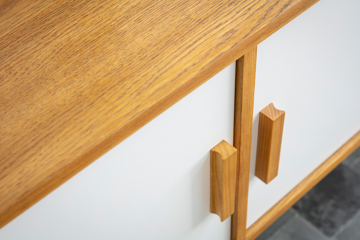 Les poignées et les pieds du buffet design HELIA sont en chêne massif, sa structure en panneaux de fibres de bois plaqué chêne, ses portes sont en panneaux de fibres de bois peint fini mat pour un look simple tout en douceur.