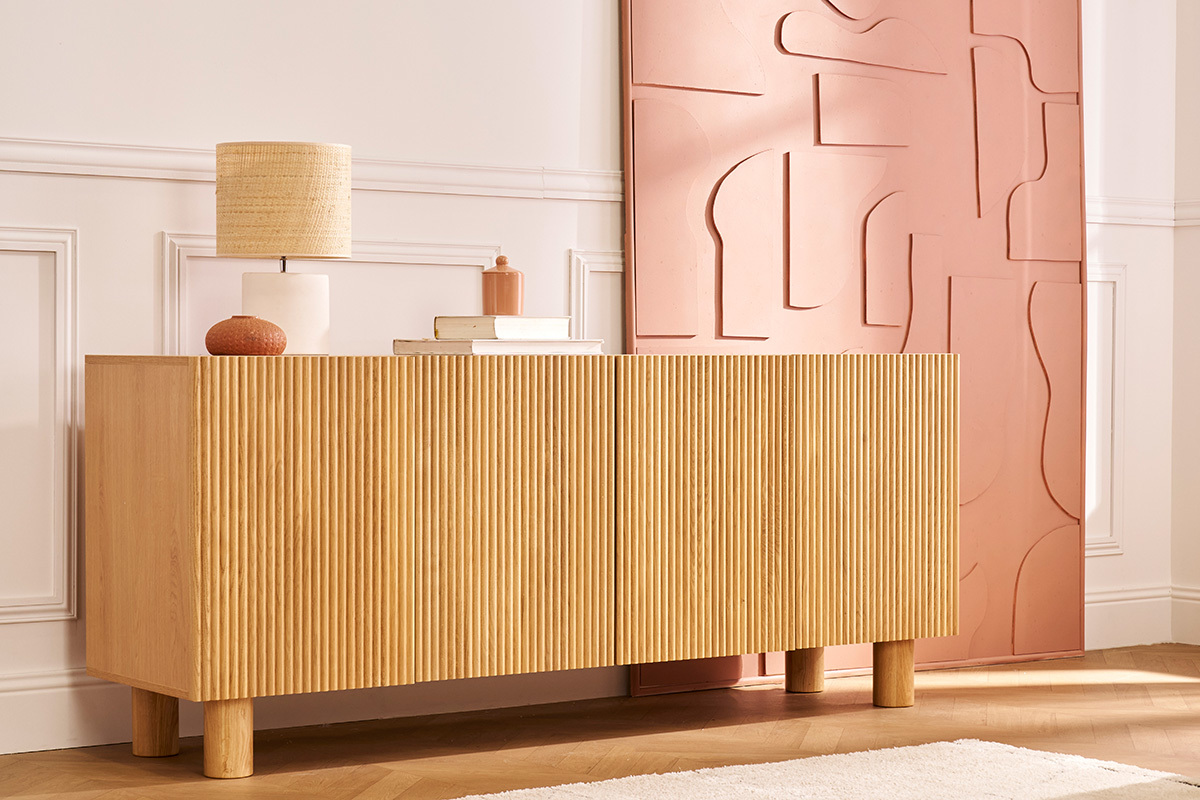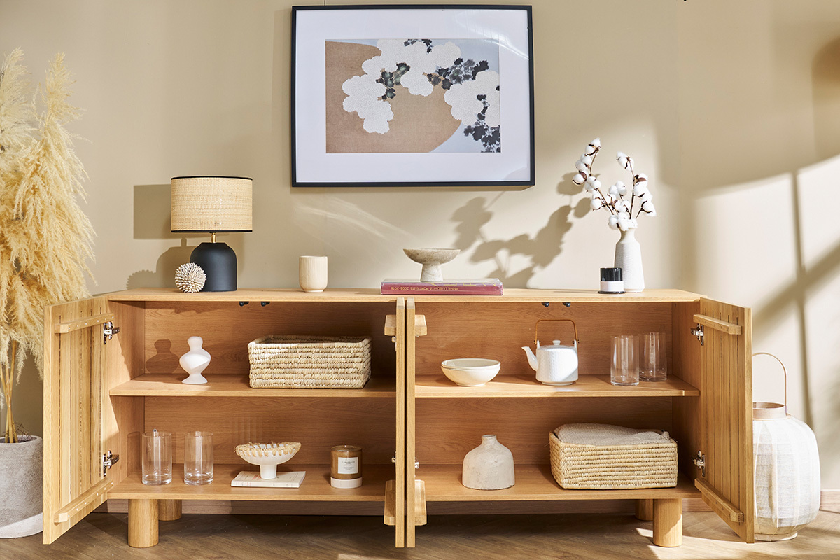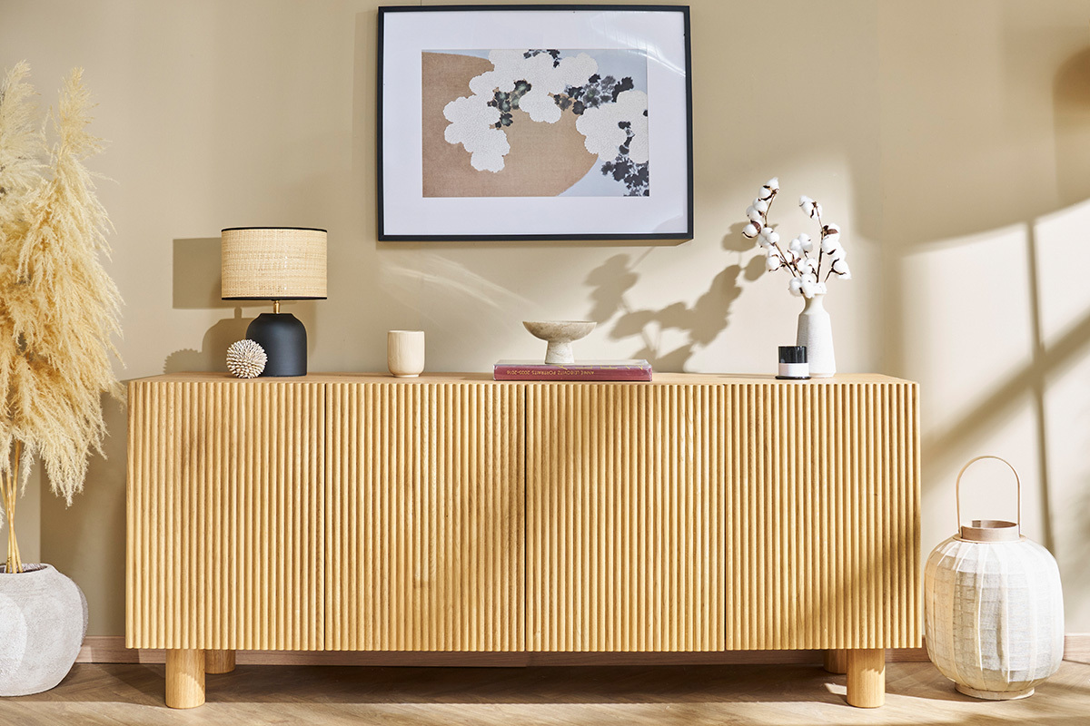 Accompagné d'une jolie lampe à poser, transformez votre intérieur avec ce magnifique buffet et profitez d'un meuble qui allie parfaitement charme et praticité.