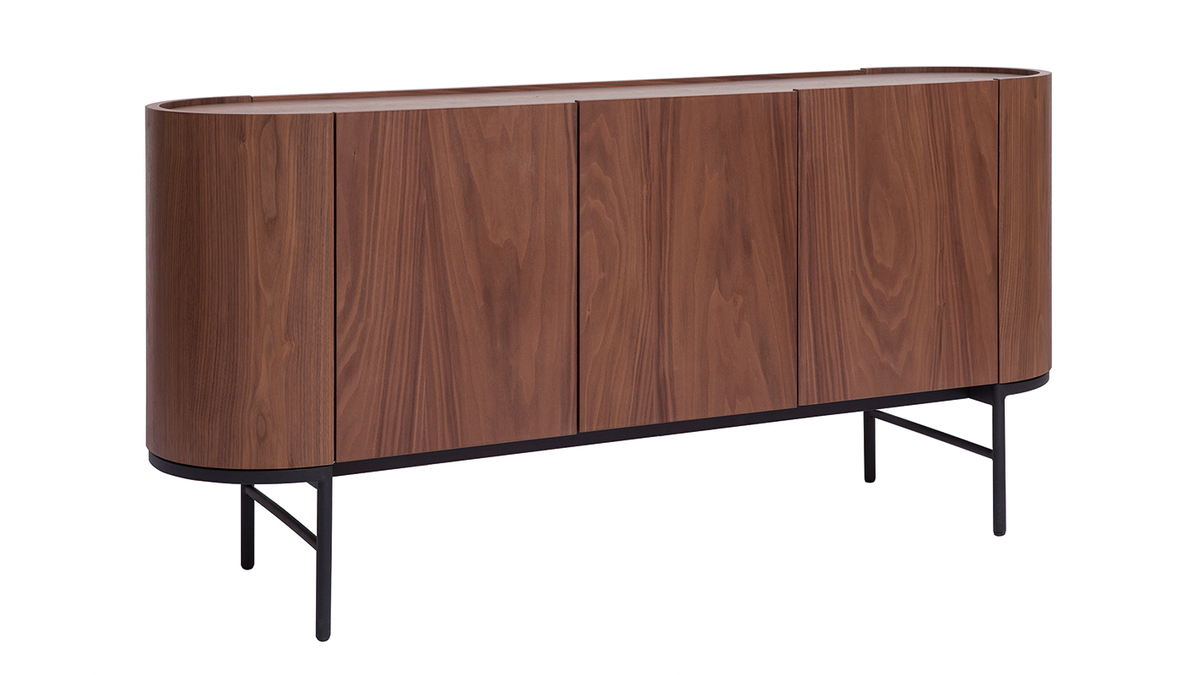Souvent attribué aux meubles vintage, le bois foncé est ici réinterprété en version ultra moderne ! Les nuances mordorées et les nervures apparentes du placage noyer épousent à ravir les galbes de ce buffet dans l'air du temps. Il ne manque plus qu'un piètement fin en métal noir pour parfaire l'allure de ce buffet trendy !