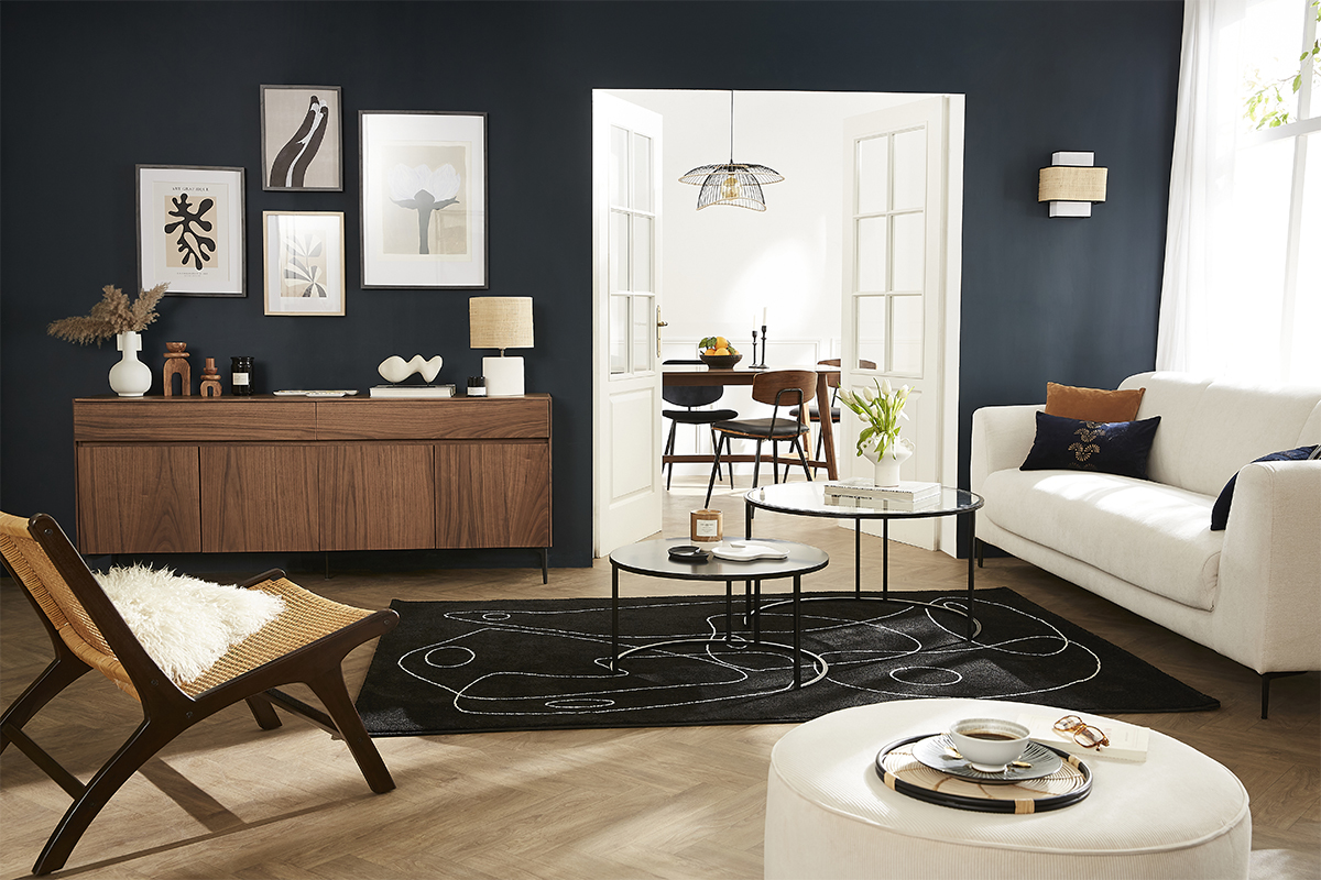 Ce buffet long associe une structure en panneaux de fibres de bois placage noyer à un piètement métallique noir ultra fin et moderne (H15 cm). Ses lignes nettes et essentielles apportent une vraie dimension contemporaine tandis que sa jolie finition noyer offre un rendu chaud et naturel. La laque transparente apposée sur la structure protège le bois sans modifier son aspect naturel. Très en vogue depuis plusieurs saisons, le noyer est une essence remarquable par ses douces nuances, ses multiples noeuds et ses veines marquées.