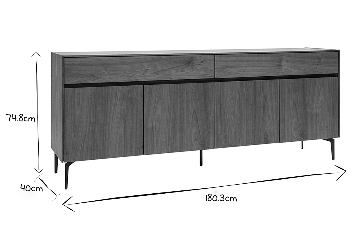 Buffet design en bois foncé noyer et métal noir 4 portes 2 tiroirs L180 cm BLISS livré prêt à assembler.