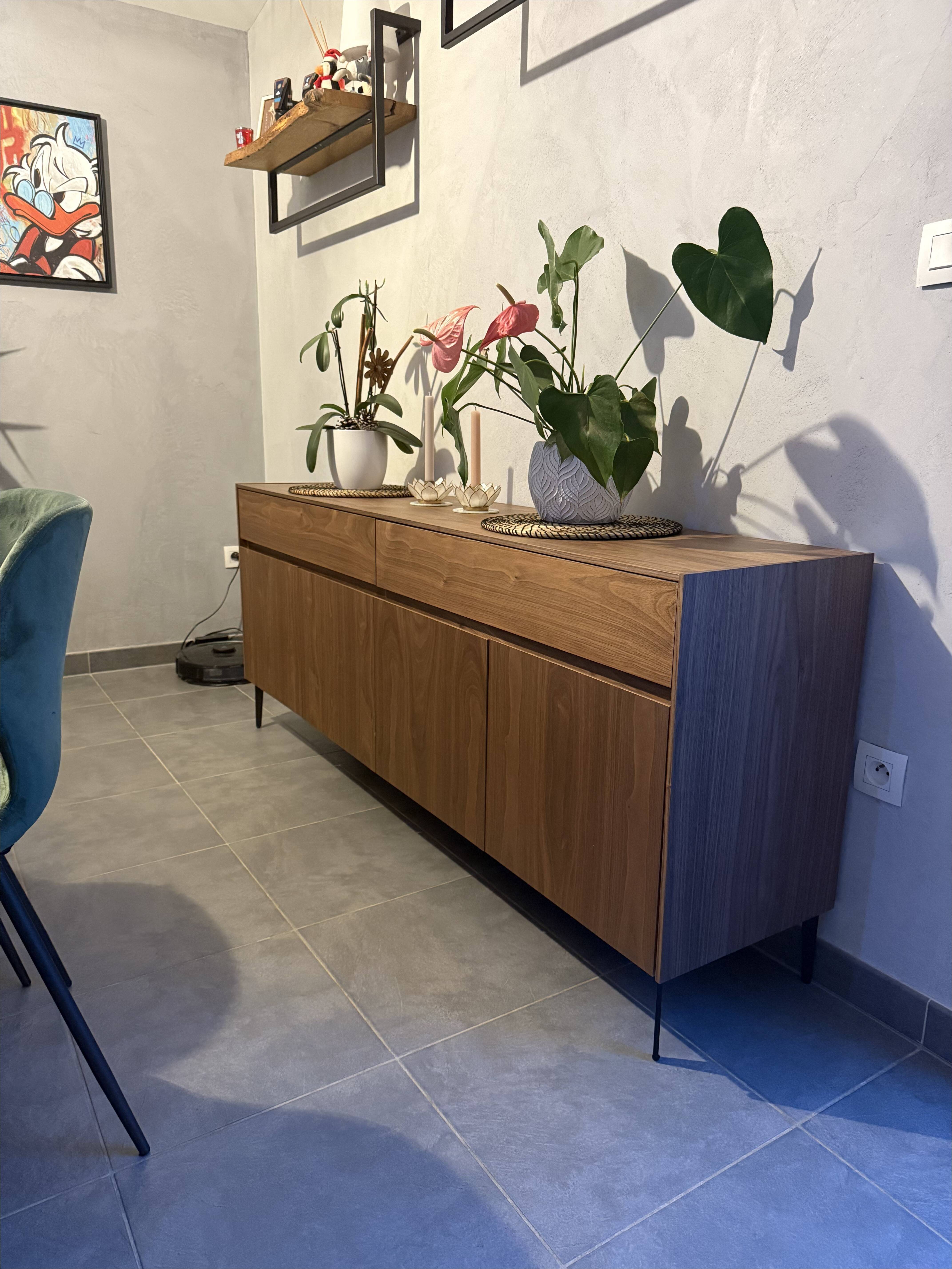 Pour un séjour sur mesure, vous pouvez coordonner ce buffet en bois foncé à un meuble TV assorti.