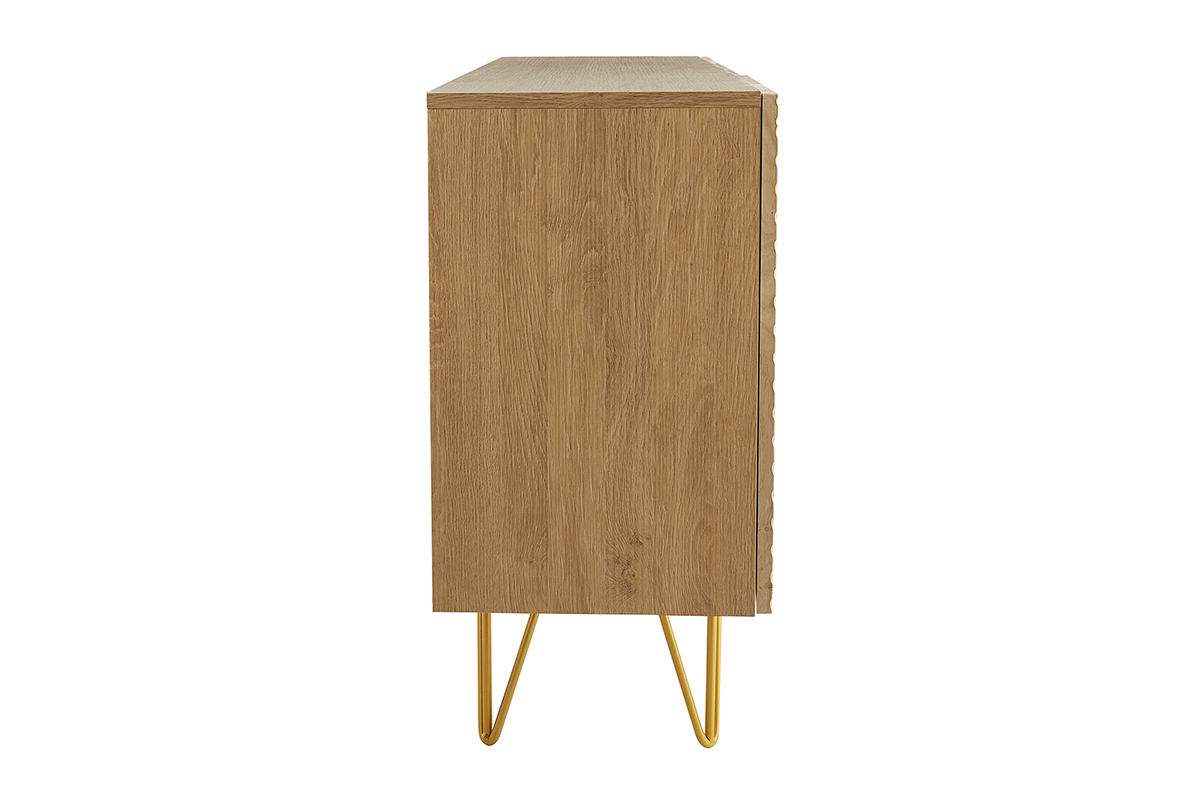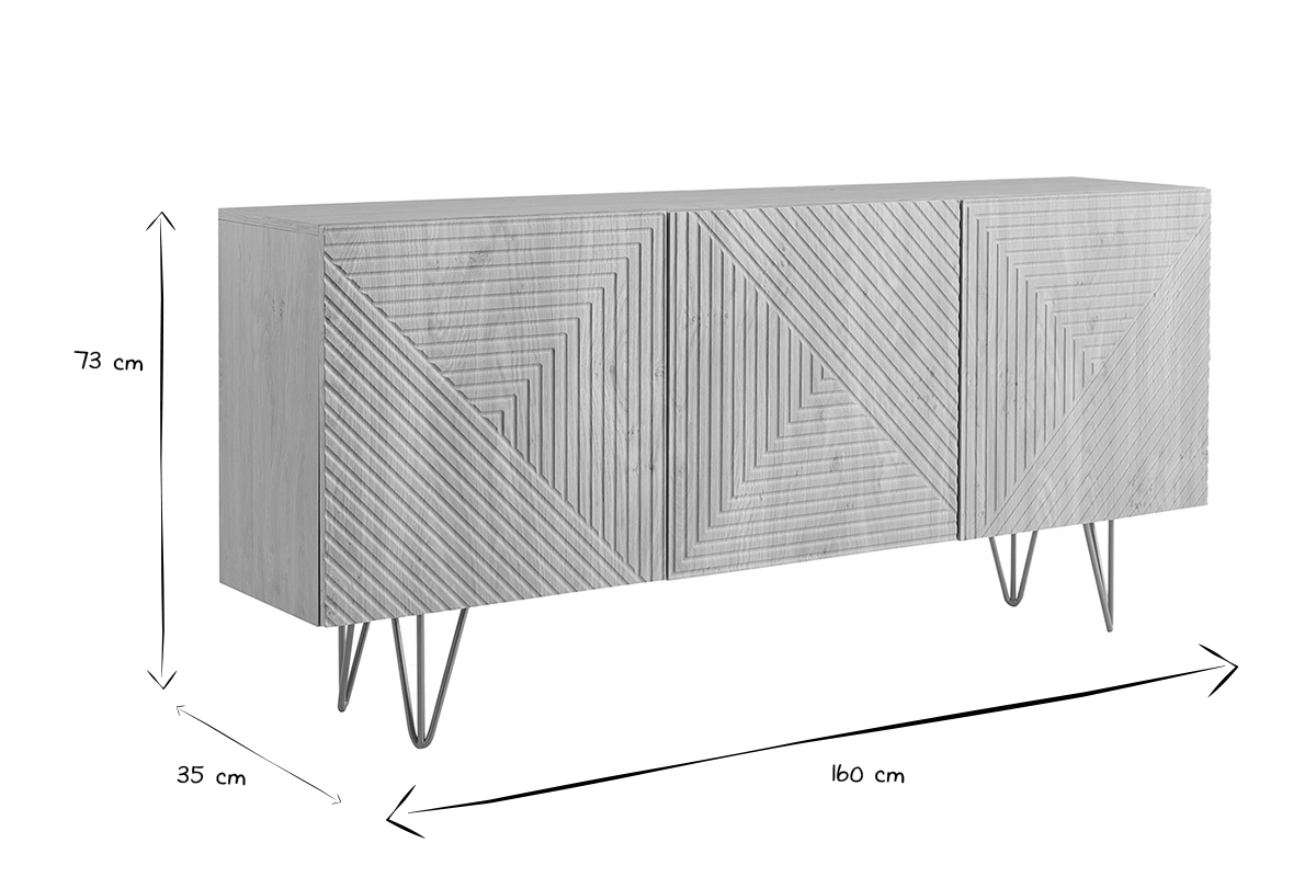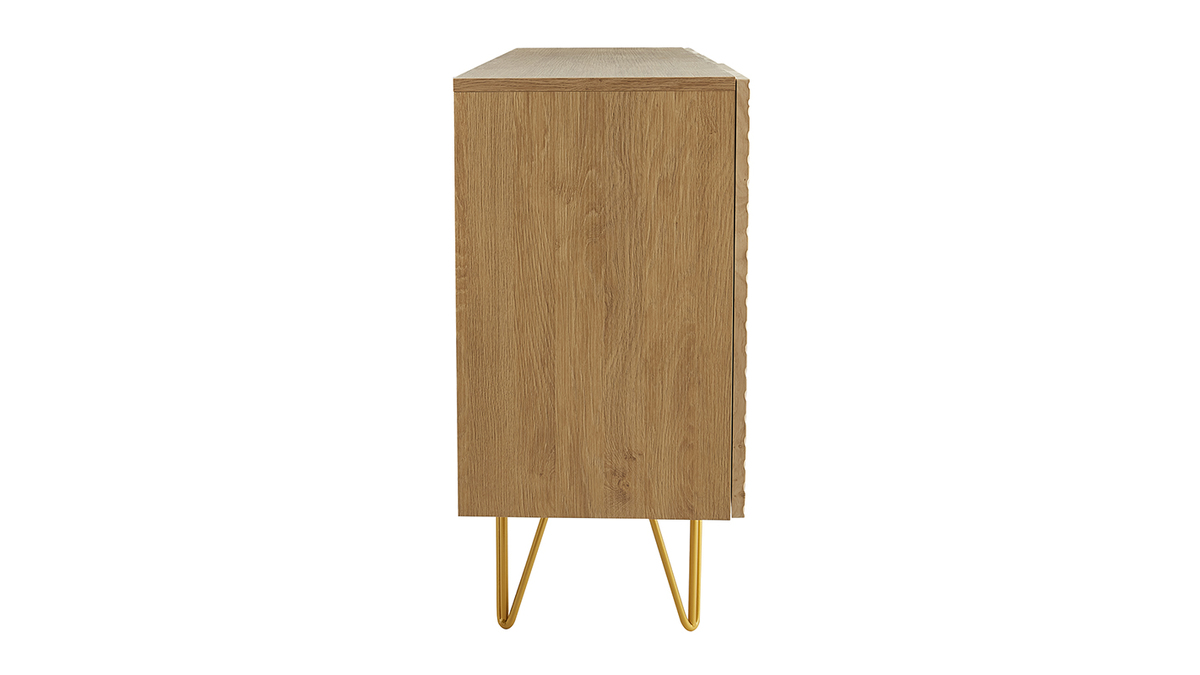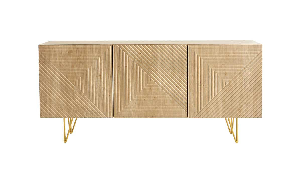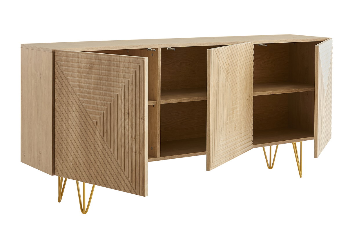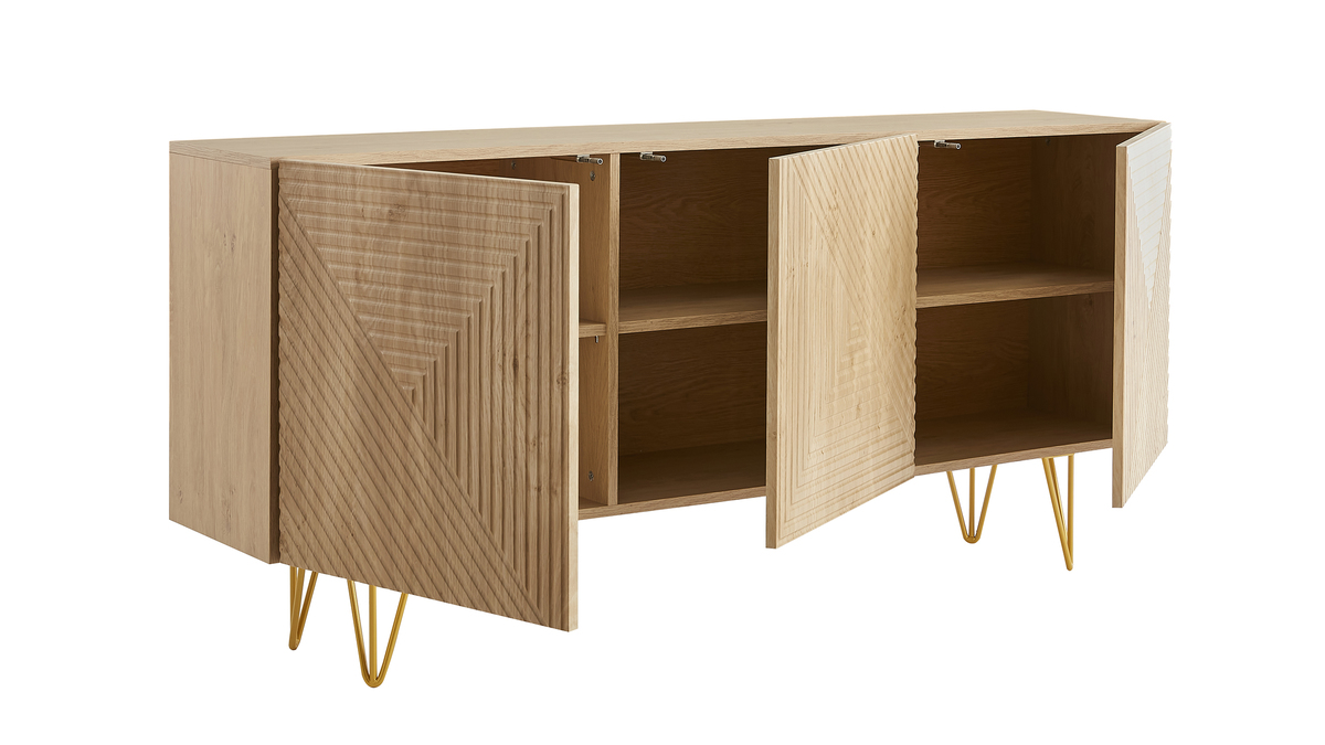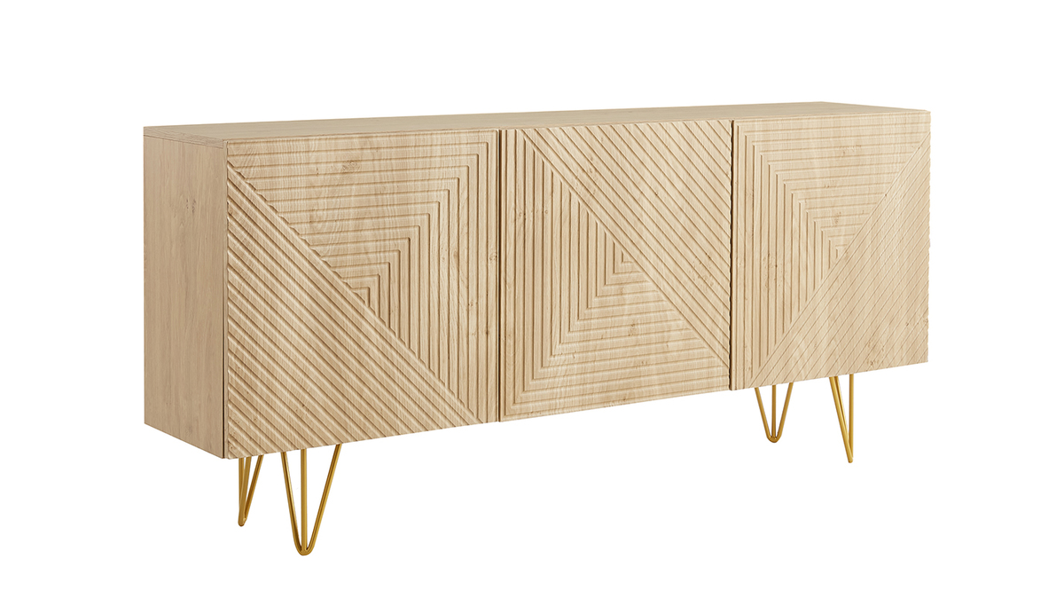 Avec le buffet OZEN, les intérieurs contemporains ont trouvé leur perle rare ! Petit bijou de design, ce buffet moderne se démarque par son originalité. Les trois portes sont ornées d'un magnifique motif géométrique en relief ton sur ton. Atypique mais discret, il fait toute l'élégance de ce meuble de rangement en enfilade. La finition bois clair de la structure est réhaussé par un piètement épingle en métal doré. Ce détail chic et coloré est travaillé avec finesse pour un style tout en légèreté.