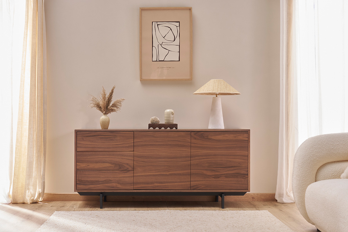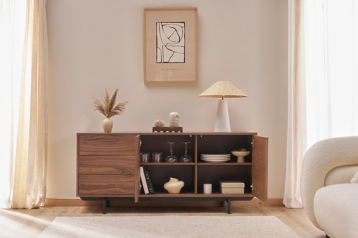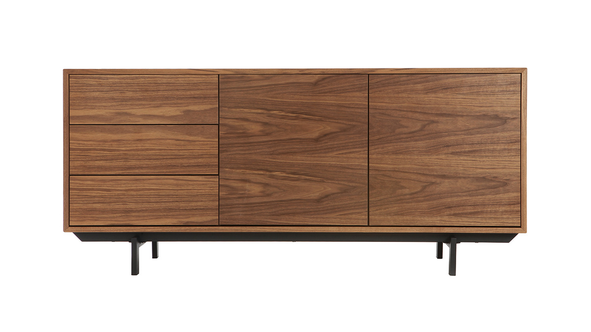 En panneaux de fibres de bois placage noyer, ce buffet en bois foncé repose sur un élégant piètement en métal noir. Il deviendra vite la pièce maîtresse de votre intérieur, apportant rangement et design aux pièces de vie aussi fonctionnelles que stylées ! Pour un rendu déco du plus bel effet, il suffira de placer sur le large plateau quelques cadres, une plante verte et une lampe à poser design.