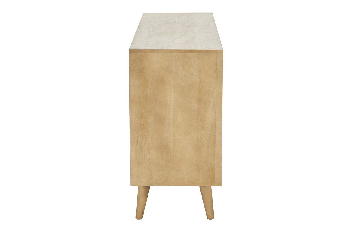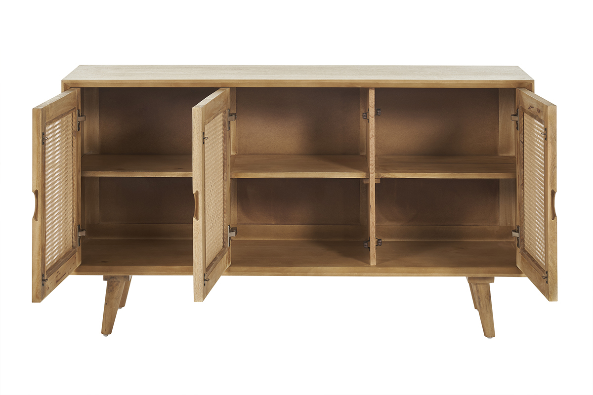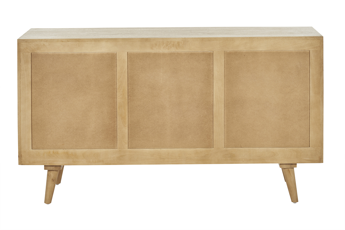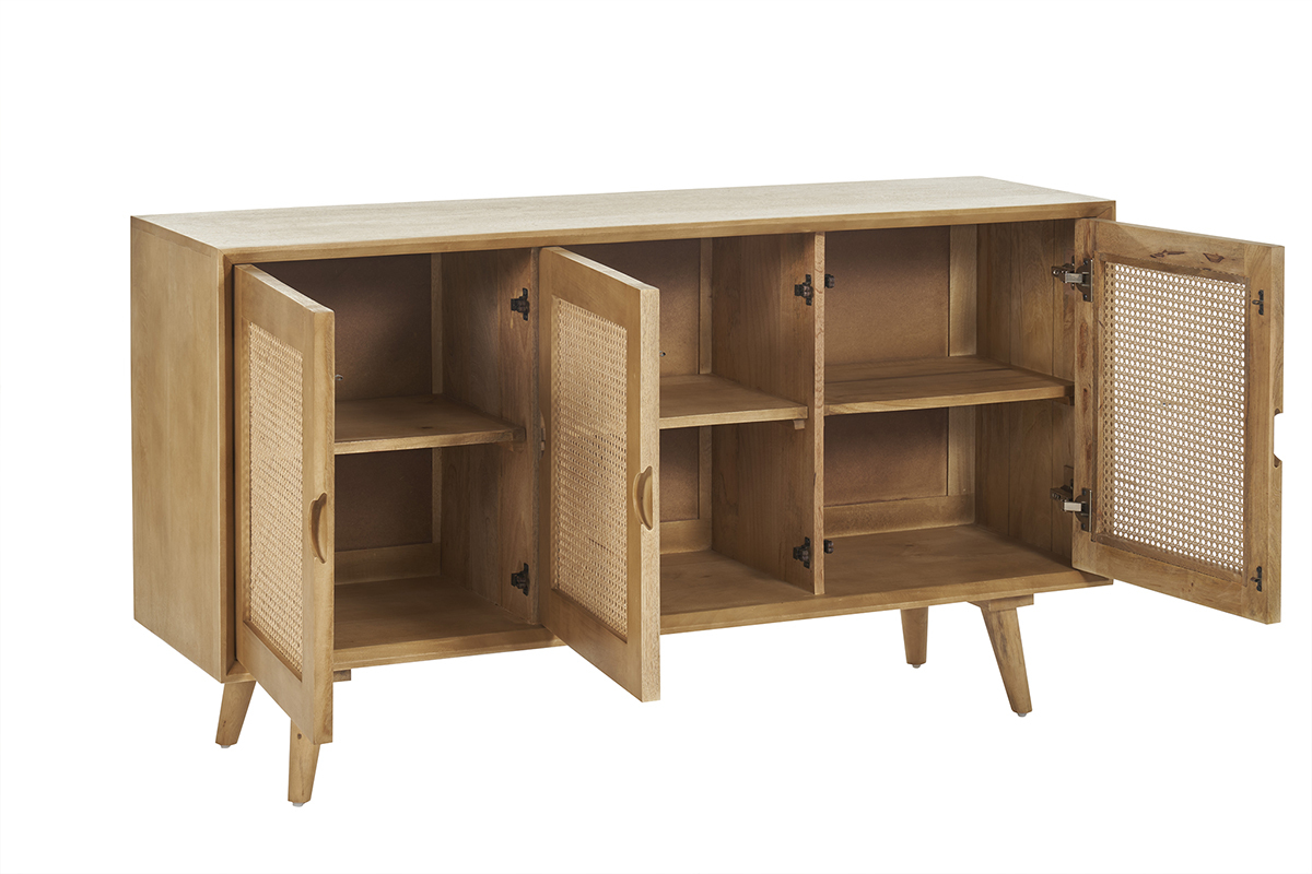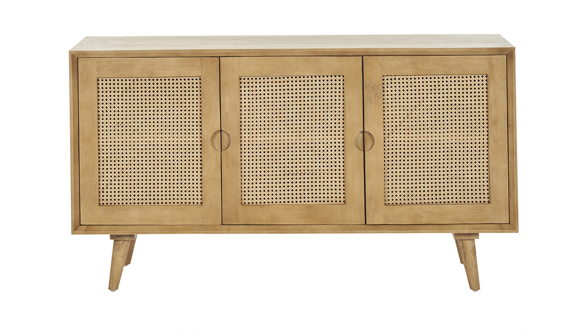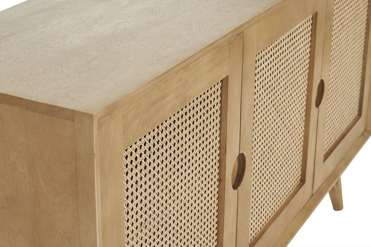 Original, ce buffet design en bois se démarque par son style inédit et sa personnalité bien affirmée. Bois blond lumineux de la structure en manguier massif et jeux d'entrelacs en rotin sur les façades de portes, forment un duo à la fois doux et empreint de caractère.
