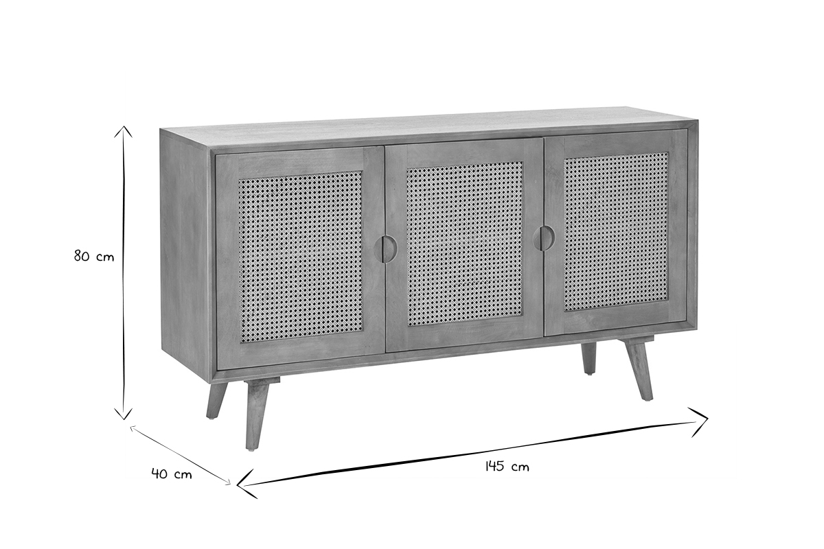 Sous des lignes minimalistes, travaillées dans les moindres détails, ce grand buffet en bois et cannage (dimensions L145 x P40 x H80 cm) offre de beaux volumes de rangement. Indispensables pour un intérieur toujours bien apprêté, découvrez sous les trois portes battantes, pas moins de six larges niches (dimensions intérieures L46.5 x P32 x H27 cm). Linge de maison, vaisselles, documents, accessoires numériques, livres ou documents... Faites place nette et gardez votre espace de vie bien ordonné grâce à ce meuble de rangement en bois et cannage. Robuste et prêt à accompagner votre quotidien pour longtemps, ce buffet long en enfilade est soutenu par un solide piètement en manguier massif.