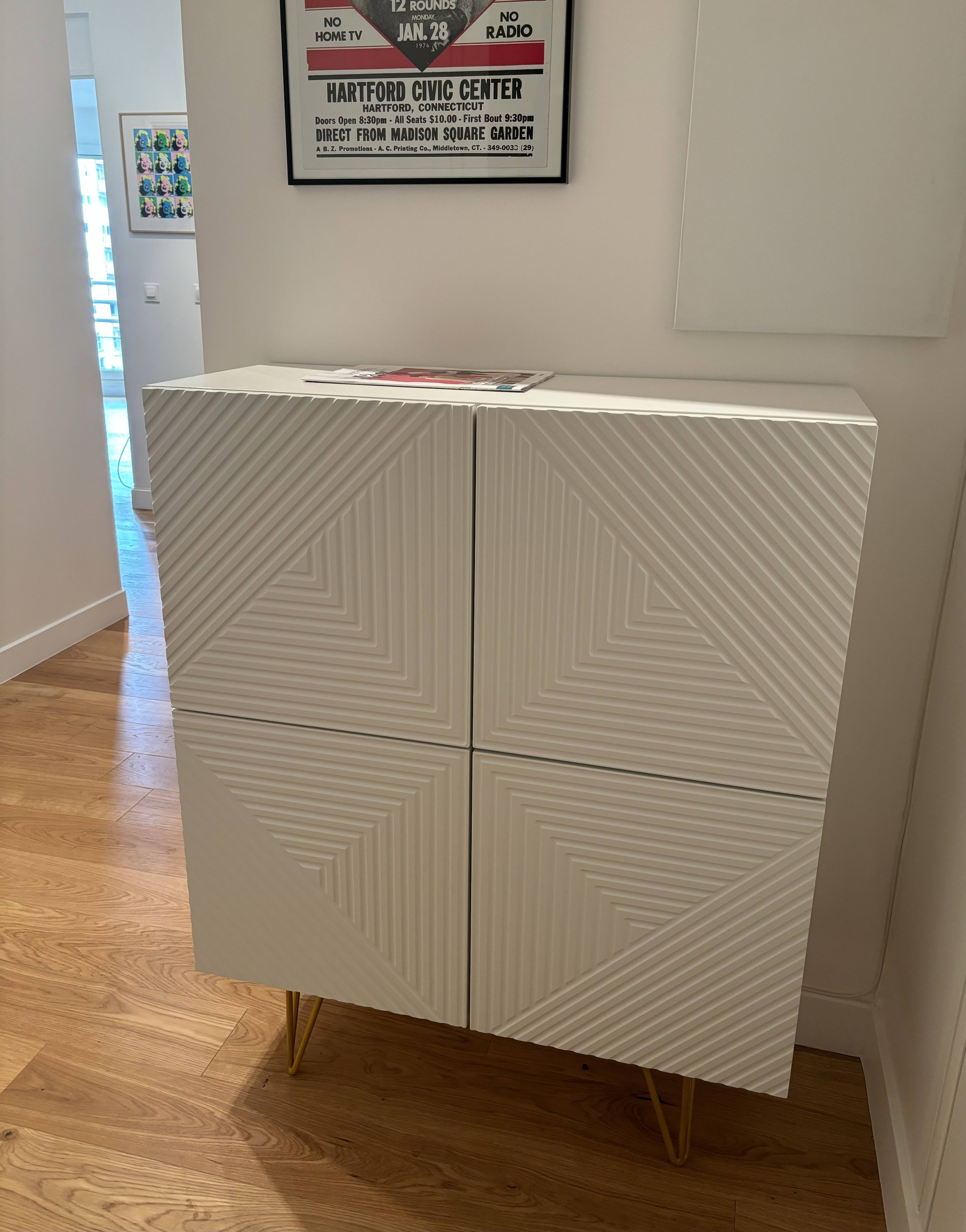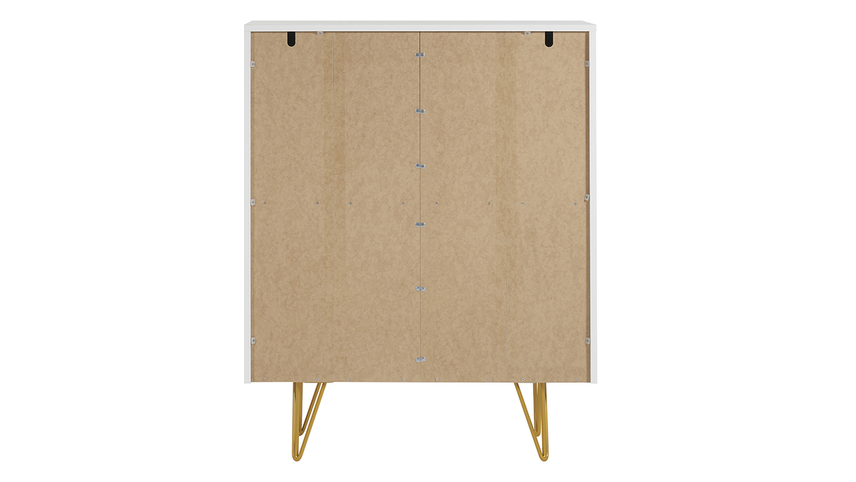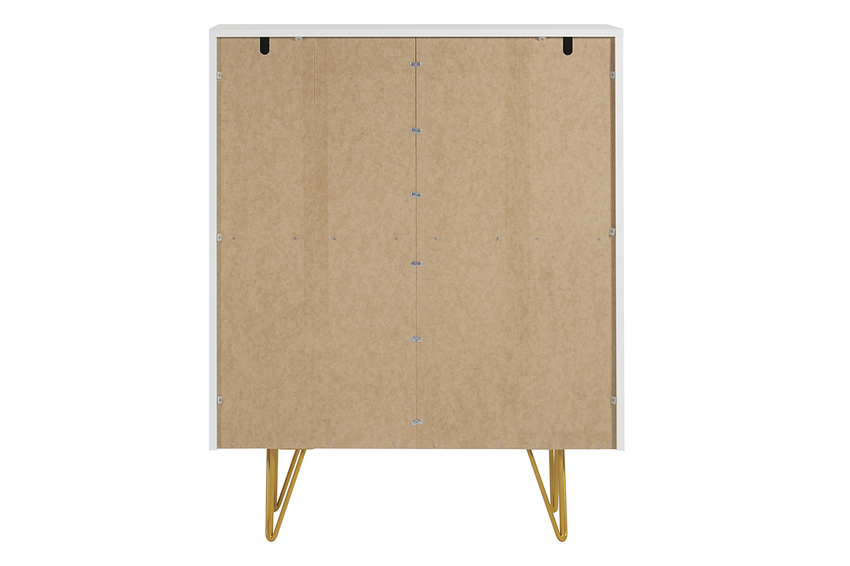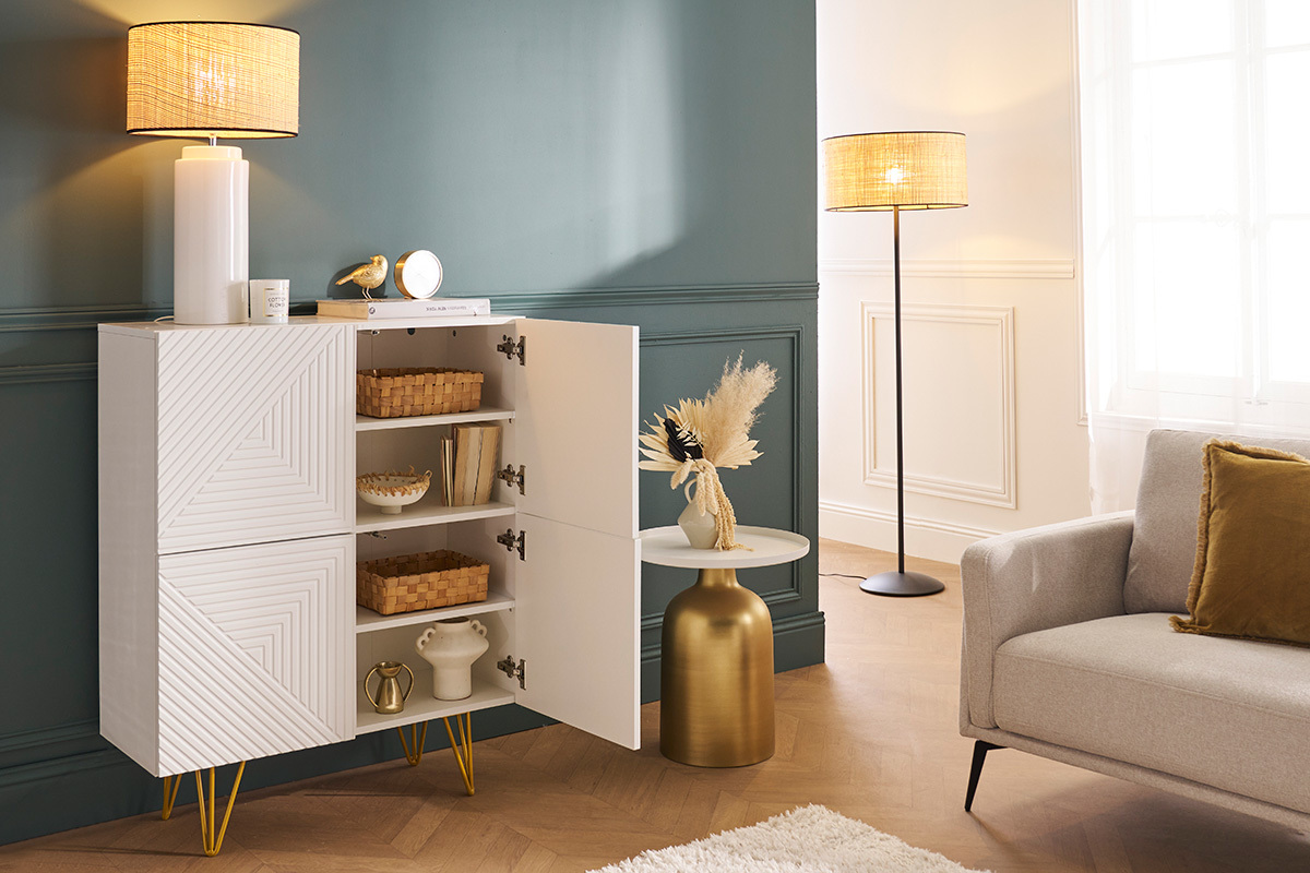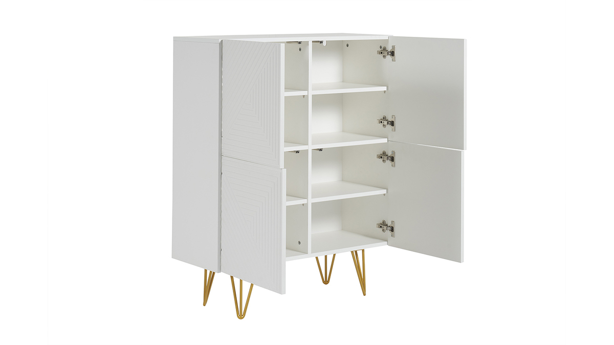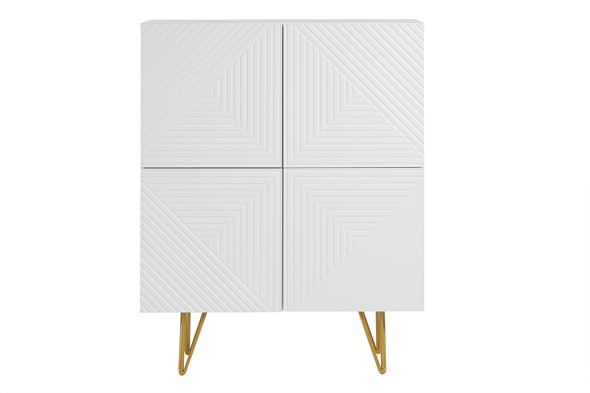 Ce buffet haut réunit tout ce qui fait le charme des pièces contemporaines. Blanc, il dégage une beauté épurée, presque minimaliste. Toute sa singularité réside sur son travail de relief et son piètement épingle en métal doré ! On adore les gravures graphiques qui ornent ses 4 portes et l'aspect aussi aérien que glamour qu'apportent ses pieds fins couleur gold.