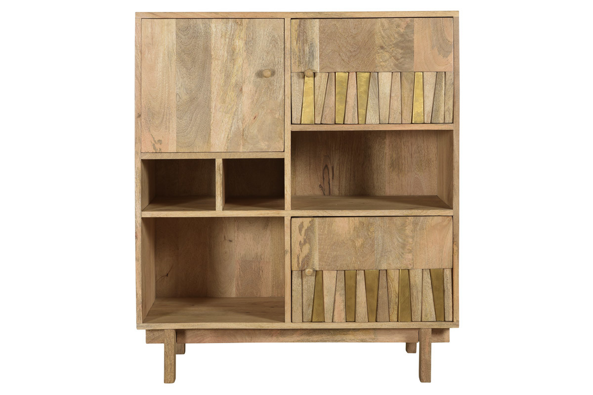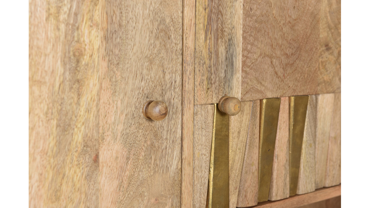 Afin de sublimer le manguier de la collection ZAIKA, j'ai voulu orner chaque meuble d'une frise incrustée de formes géométriques en bois, dont certaines sont recouvertes de laiton. Leurs irrégularités donnent du relief et du caractère à ses façades et le laiton apporte de part et d'autre des touches de lumière.