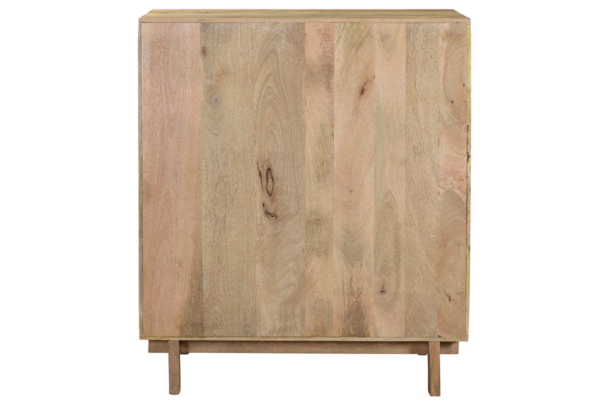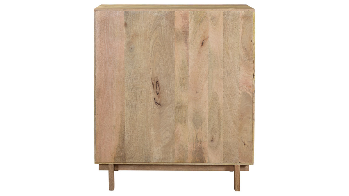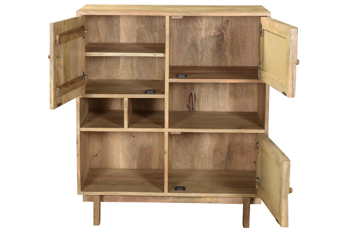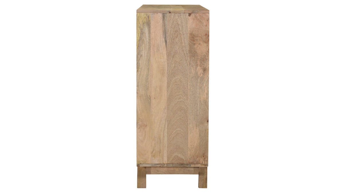 Imaginé par notre designer Caroline Marliac et conçu de manière artisanale avec le cachet unique du "fait main", il saura apporter charme et personnalité à votre séjour ou votre salle à manger. Il est composé de manguier, connu pour ses nuances chaleureuses et sa solidité, et d'inserts géométriques en bois peint doré. L'association d'un bois brut aux détails lumineux fait de ce buffet une pièce décorative élégante et particulièrement originale.
