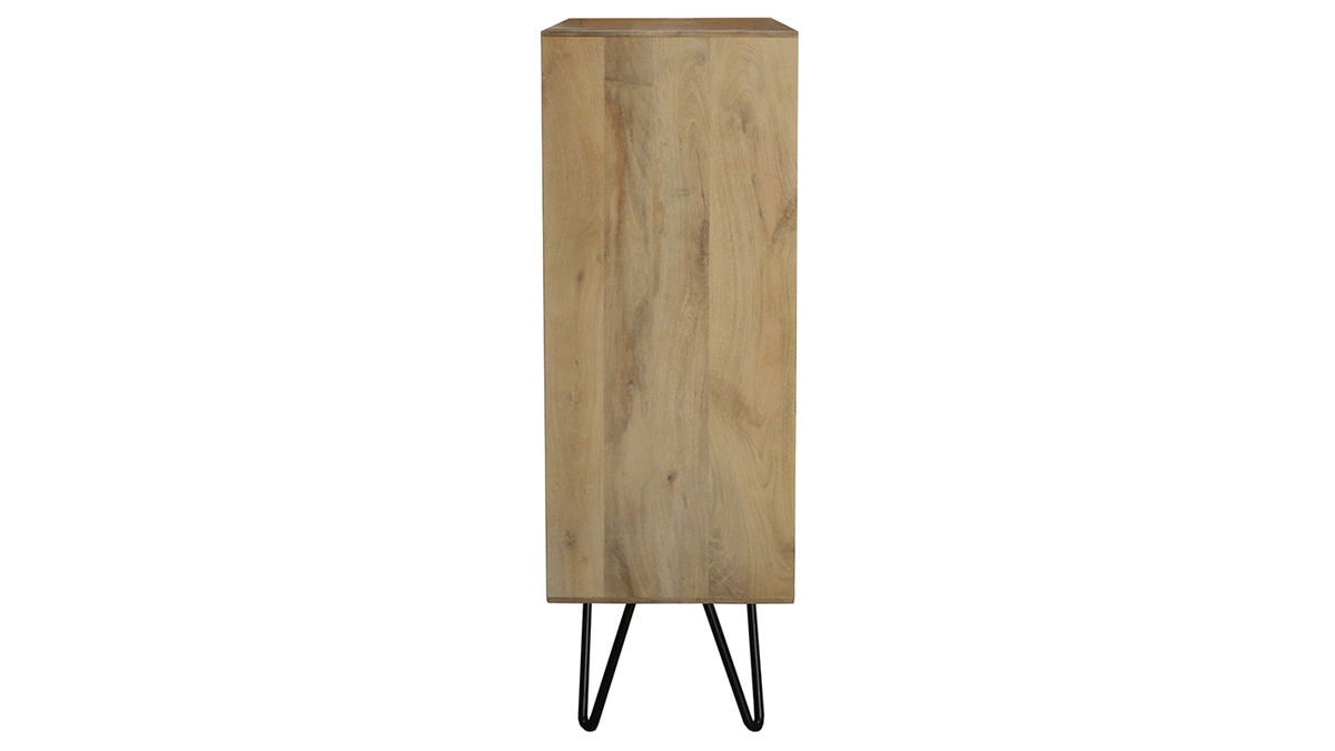 Imaginé par Caroline Marliac, designer Miliboo, le buffet haut VIBES est conçu de manière artisanale en manguier et métal noir. Le manguier est une essence de bois naturelle qui offre différentes nuances et des détails uniques qui en font un meuble original. Le piètement en épingle qui complète le tout donne un côté aérien à ce meuble en bois massif.