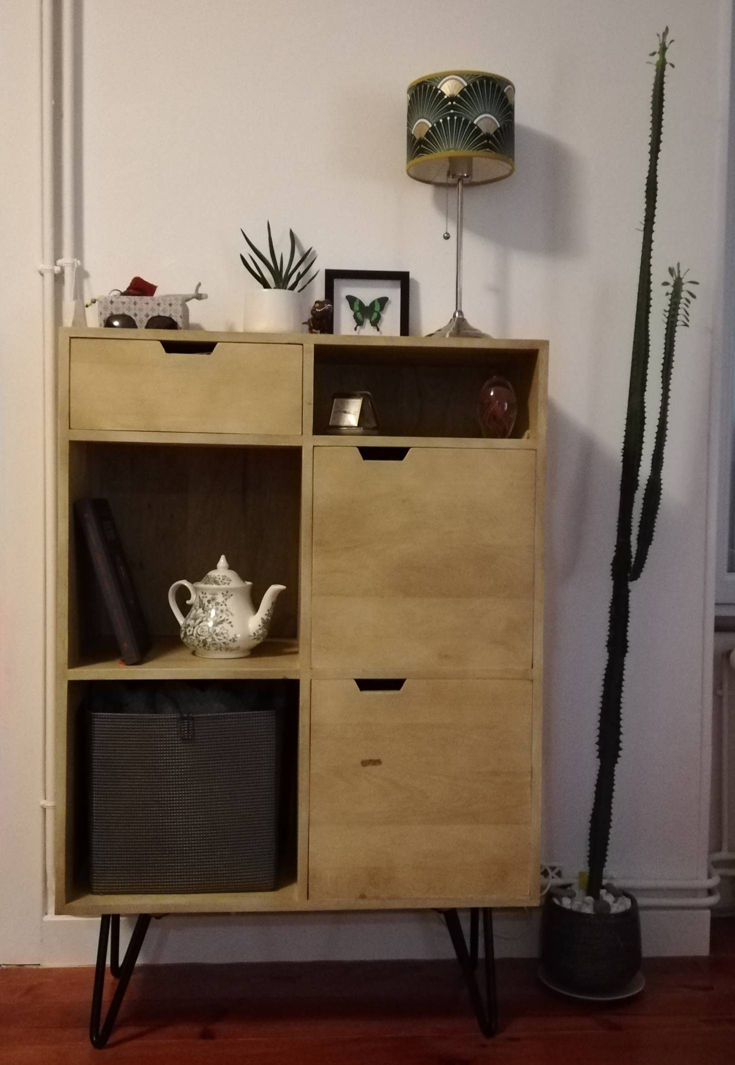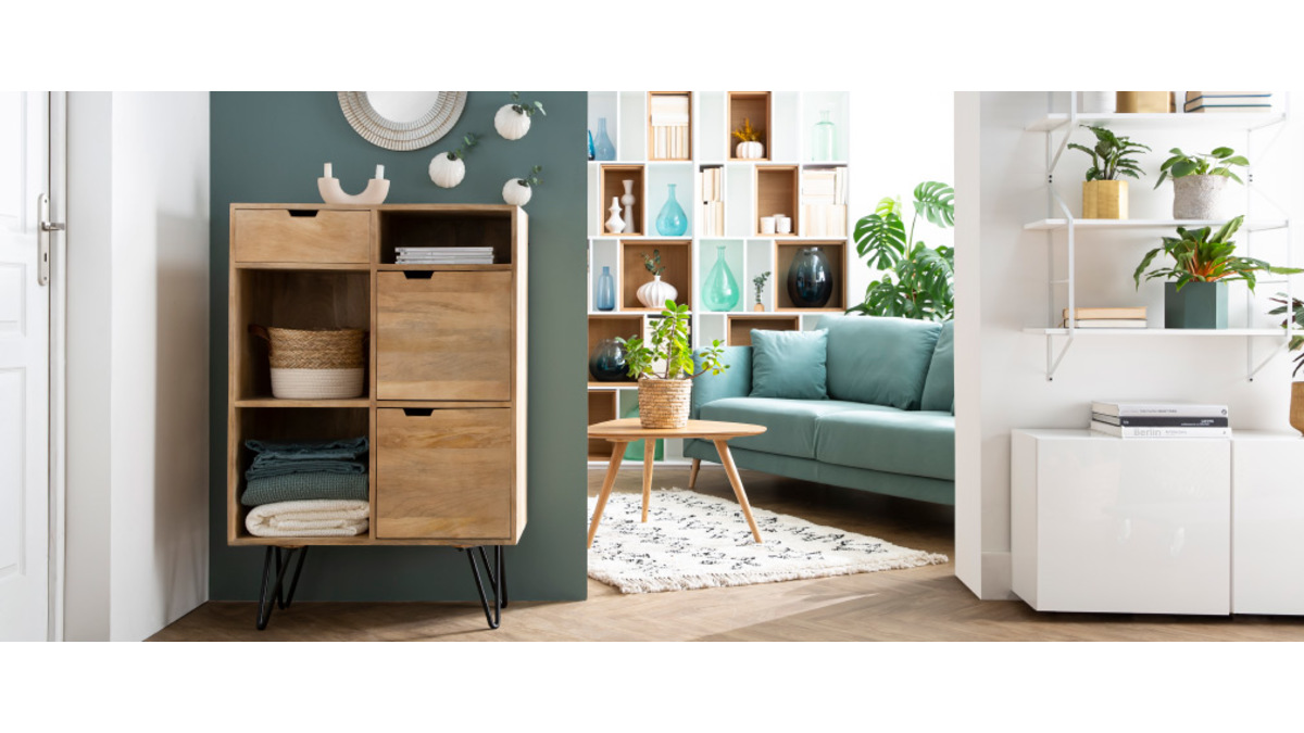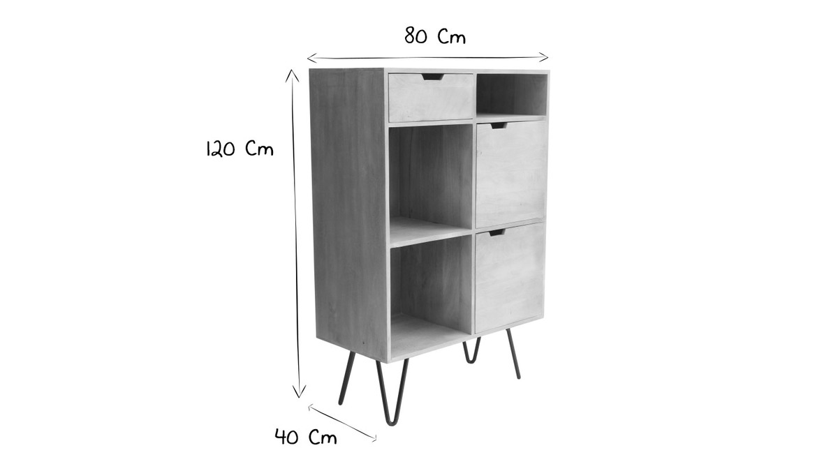 Équipé de trois niches ouvertes, deux niches fermées et un tiroir, ce meuble offre une belle capacité de rangement. Vaisselle, documents ou encore couverts peuvent être dissimulés sans problème tandis que les livres, les plantes et objets déco trouveront leur place sur une étagère.