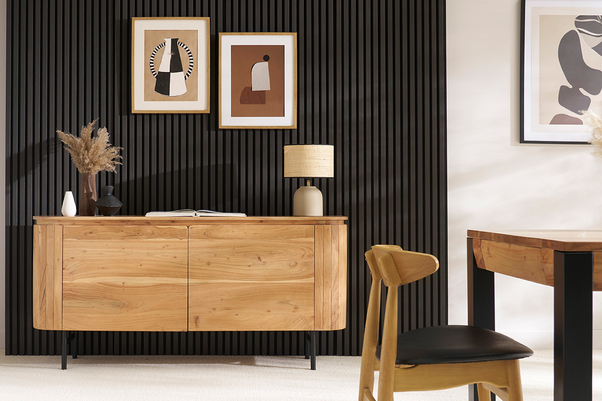 Mix and match réussi, le caisson en acacia massif avec sa forme oblongue répond avec élégance au piètement en métal noir.