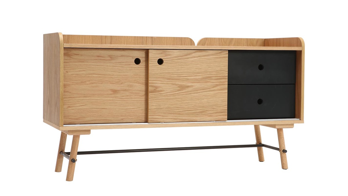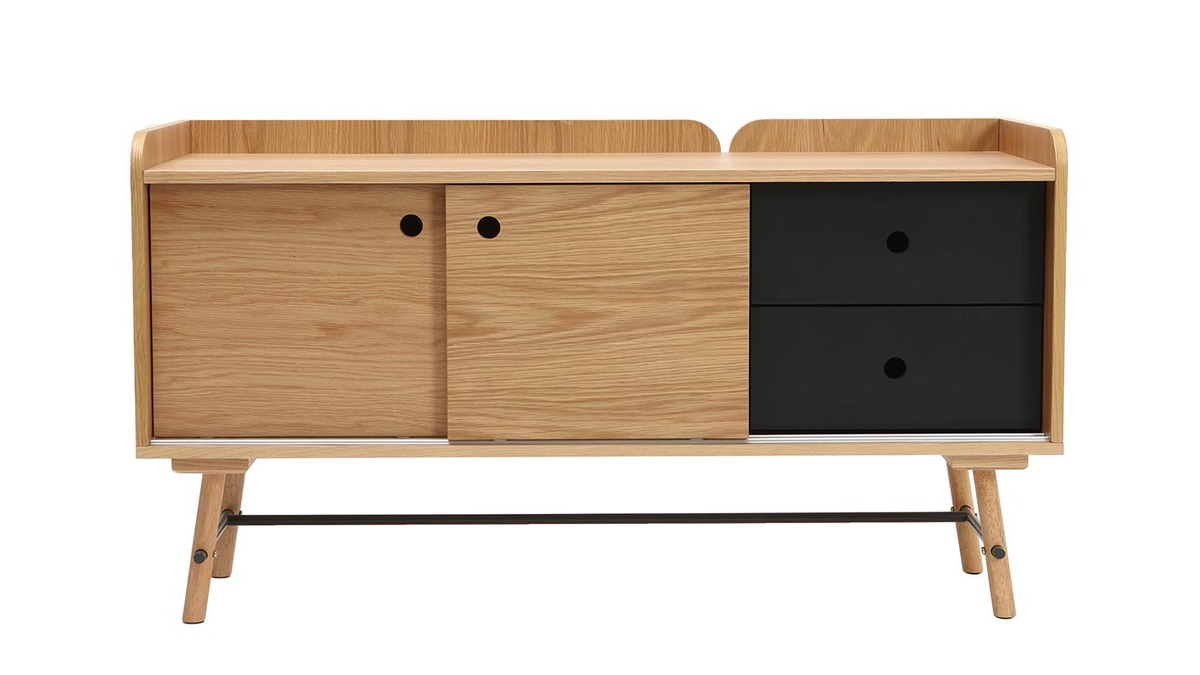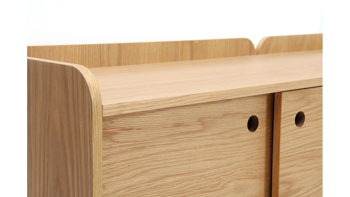 Idéalement bien pensé, nos designers mettent en avant la praticité et la fonctionnalité de ce petit buffet. Ses rebords légèrement surélevés vous permettent de ne pas faire tomber ce qui se trouve sur le plateau. De plus, l'arrière du buffet dispose d'une découpe rectiligne sur toute la hauteur du meuble vous offrant la possibilité de faire passer vos câbles en toute discrétion. Vous pouvez ainsi utiliser ce meuble en qualité de meuble TV.