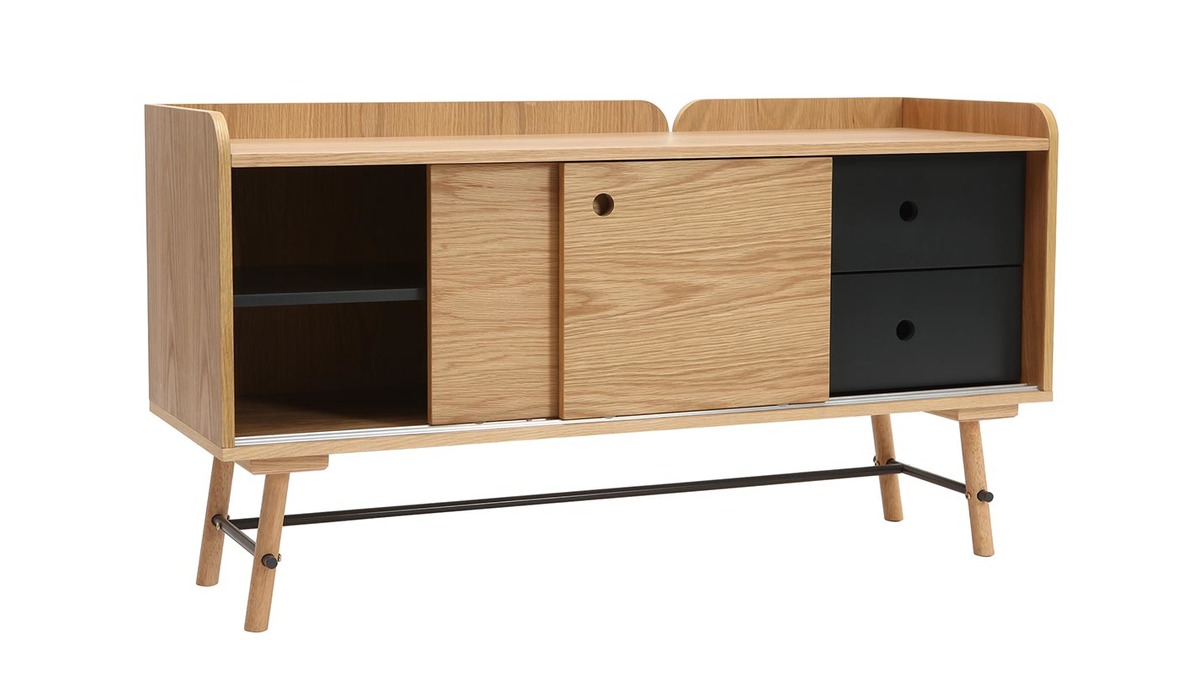 Ce buffet en bois et gris anthracite se veut très représentatif des fondamentaux du style scandi-japonais. En effet, il possède un design très pur et sobre avec des détails parfaitement travaillés. Ses ouvertures arrondies en guise de poignées et sa finition en chêne clair reflètent typiquement ce côté japonais. Une finition en peinture gris mat appuie également les traits de ce style car elle souligne et met en avant les éléments distinctifs de ce buffet.