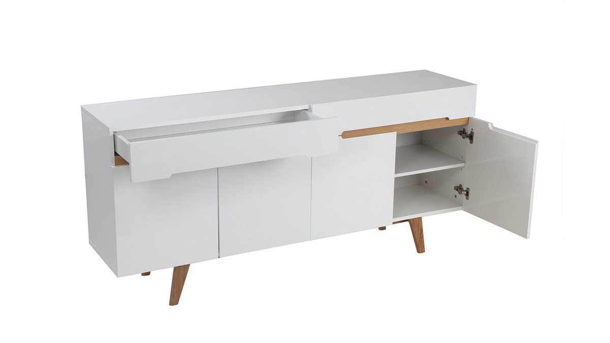 Alliance entre le blanc brillant et le bois, ce buffet MELKA possède un esthétisme superbe, et sera parfait autant dans un intérieur contemporain qu'à l'inspiration nordique.