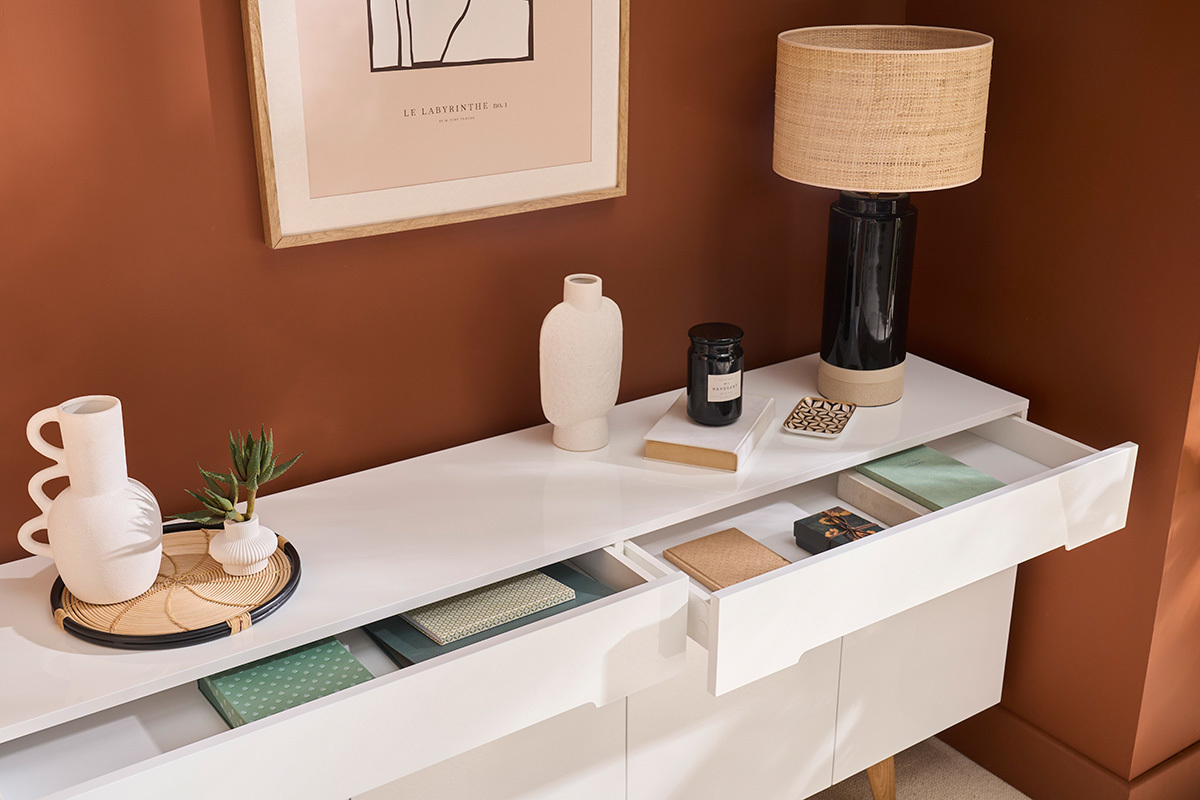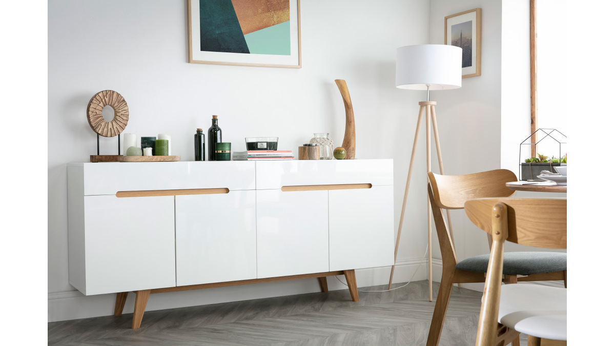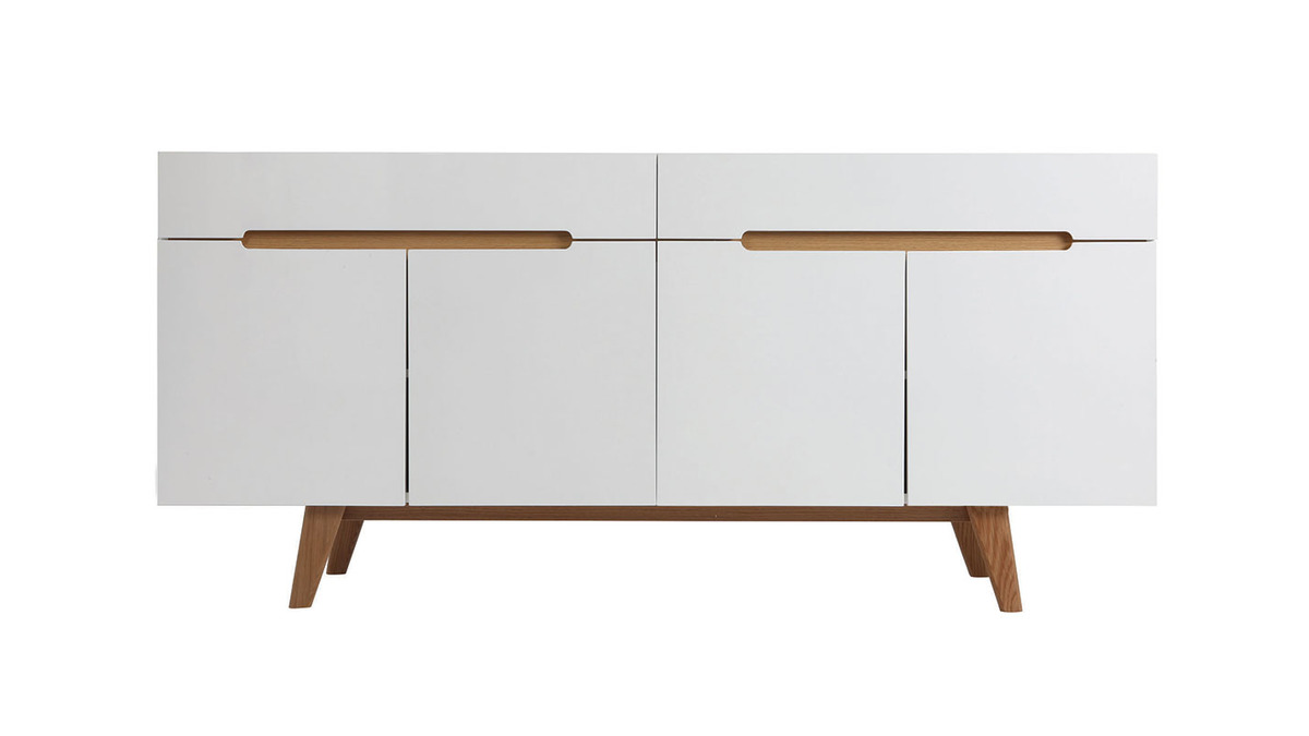 Ce buffet blanc et bois trouvera naturellement sa place dans une cuisine ou un grand séjour et prendra ses marques dans de nombreuses ambiances déco où il apportera une touche de douceur épure. Une lampe à poser design habillera élégamment le long plateau de ce buffet scandinave.