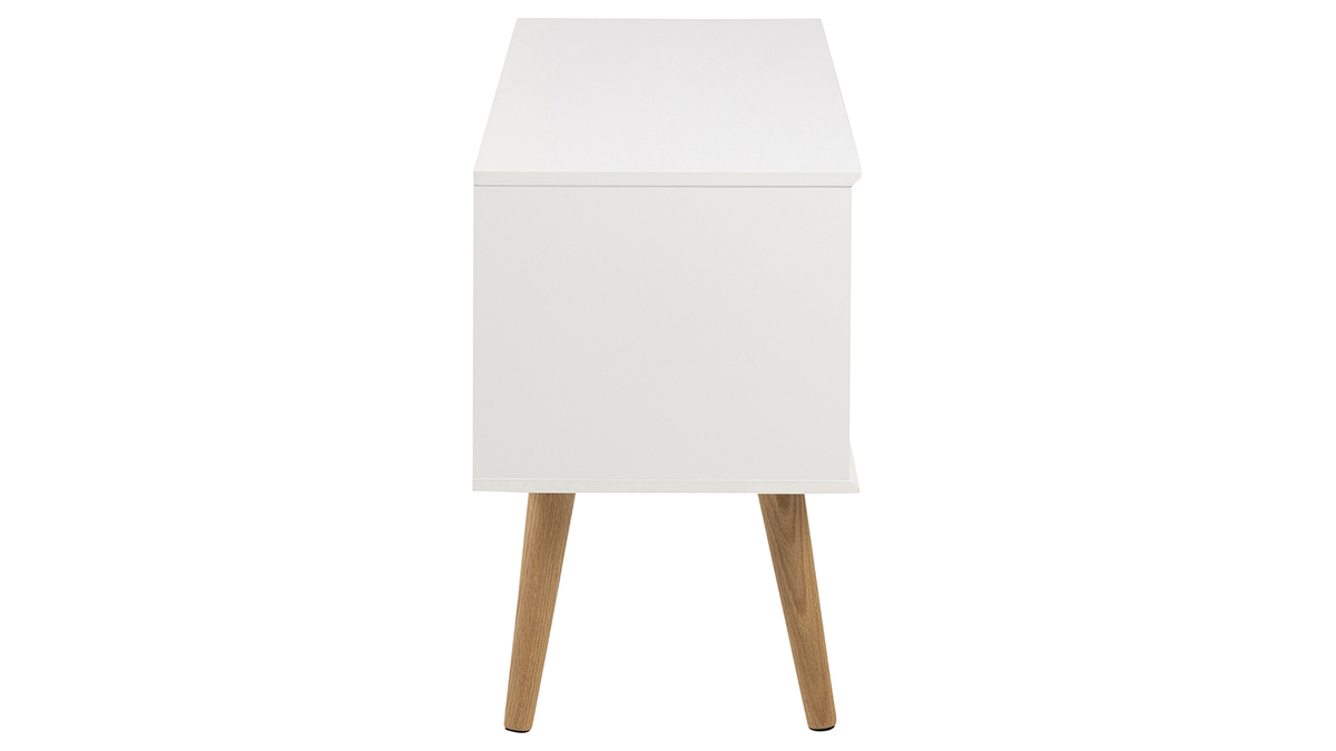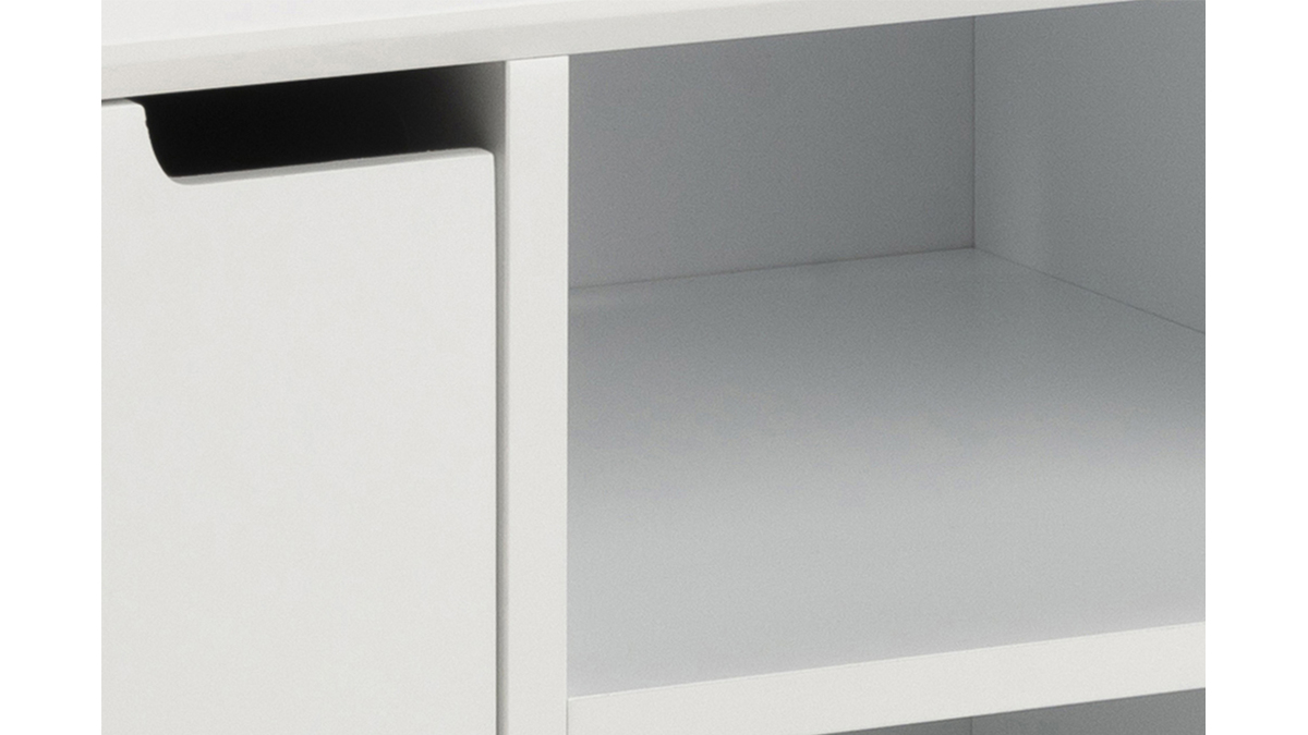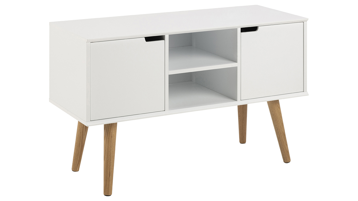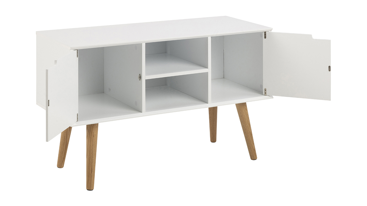 Ce buffet design possède deux casiers de rangement pour tout objet du quotidien. Il dispose également de deux niches ouvertes pouvant accueillir des accessoires électroniques ou consoles de jeux par exemple. Le passe-câble intégré permet en effet de transformer le buffet SNOOP en petit meuble TV.