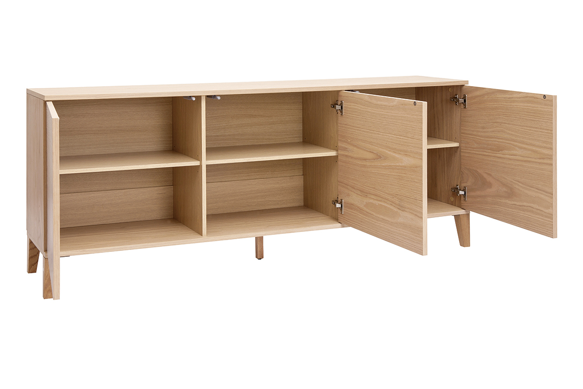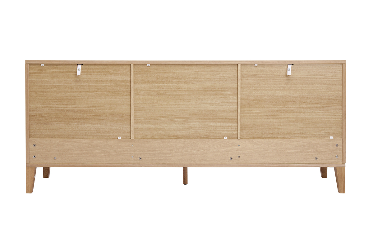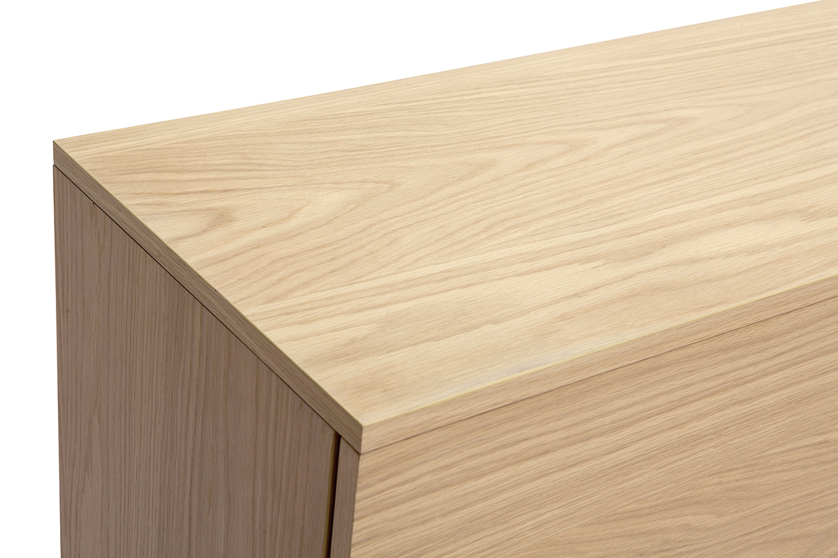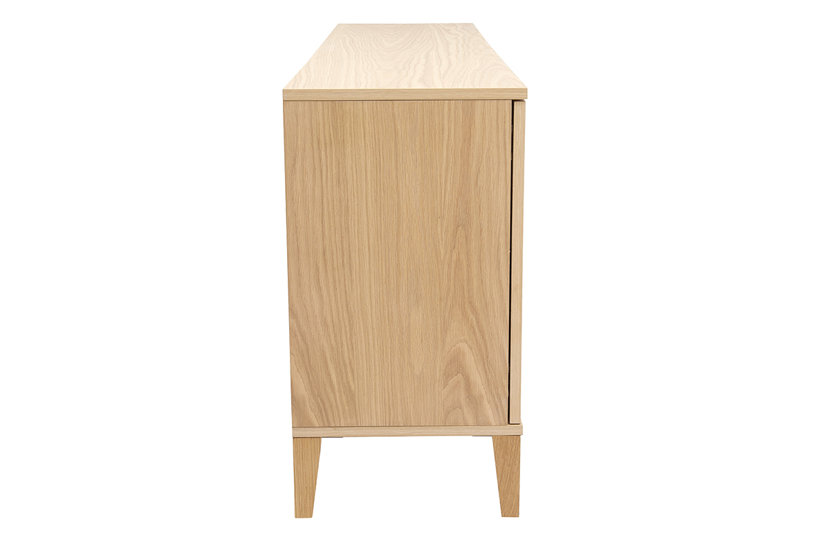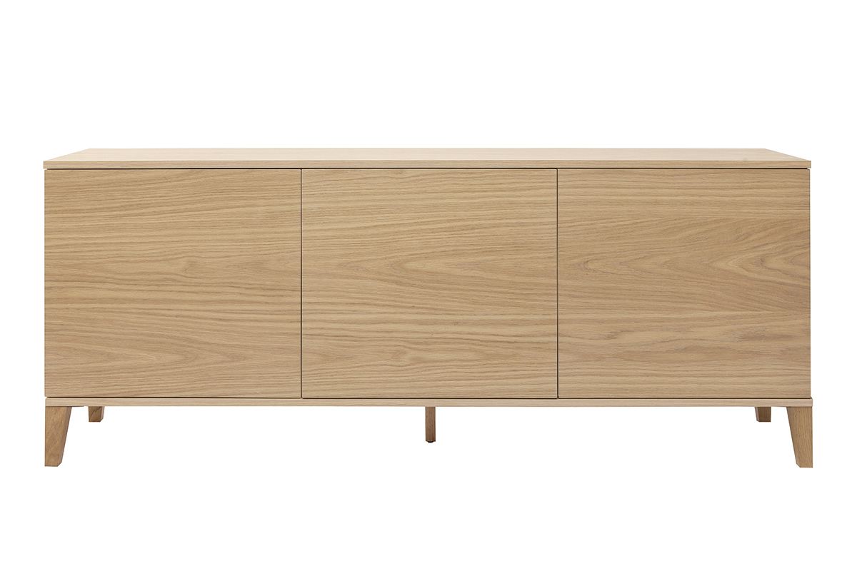 Entre la contemporanéité de ses lignes et la douceur de son matériau, ce grand buffet (L180 x P40 x H75.5 cm) trône en majesté dans les séjours contemporains. Son design épuré met à l'honneur la beauté et l'authenticité du bois. Sa structure en panneaux de fibres de bois se pare en effet d'un élégant placage en chêne blond d'inspiration scandinave. Un vernis transparent est apposé sur l'ensemble de la structure en chêne plaqué afin de nourrir et protéger la surface.