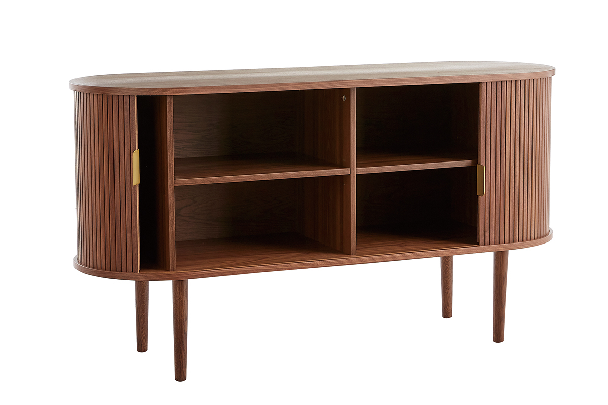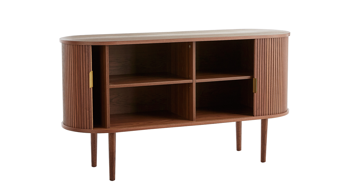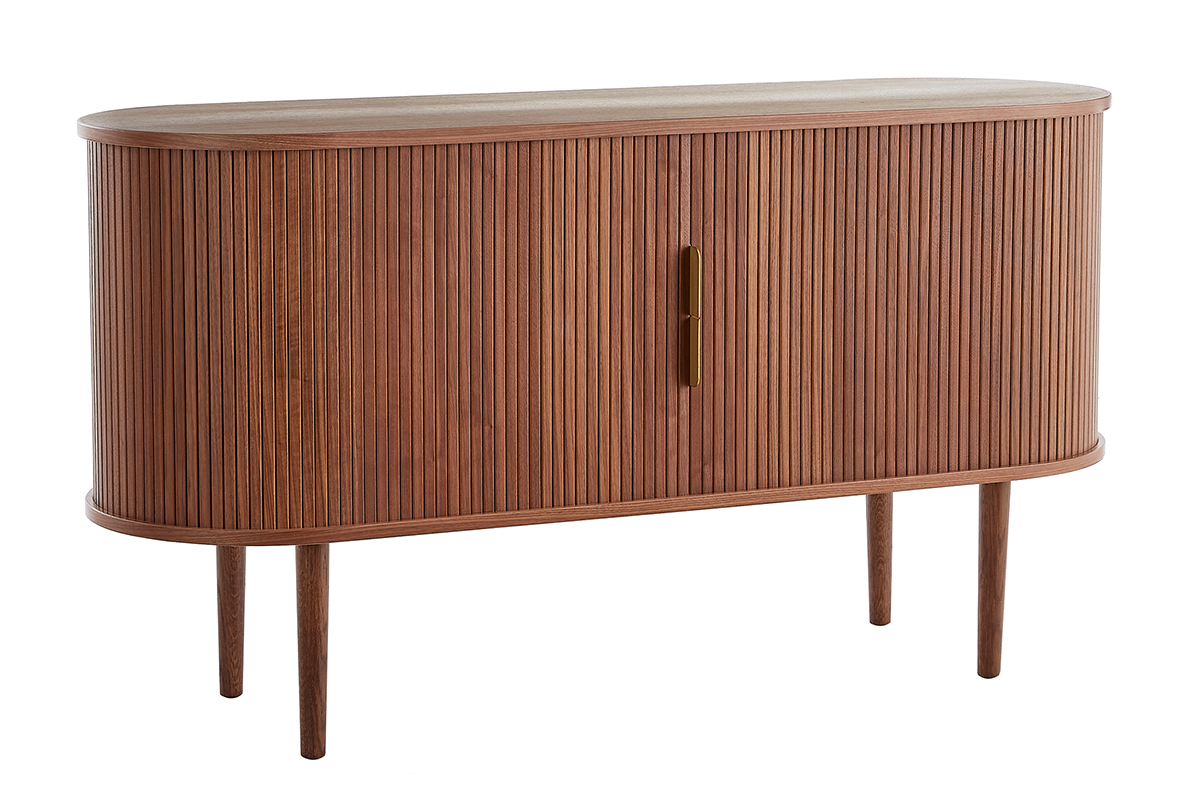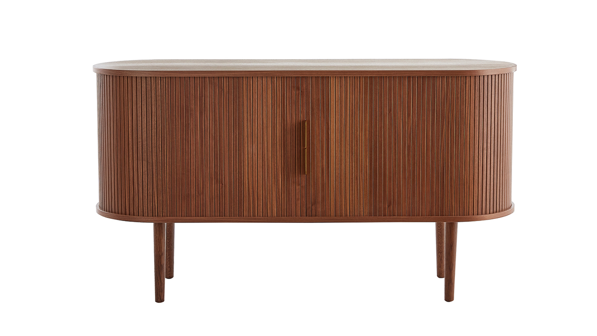 Forme oblongue, pieds hauts et légèrement fuselés, portes rideaux coulissantes en lattes de bois, détail minimaliste des poignées dorées... Question esthétique, ce buffet design n'a rien à envier aux plus grands !