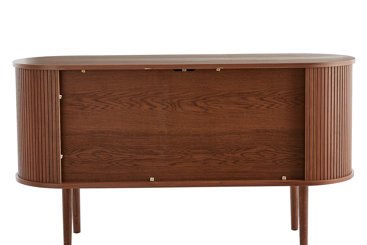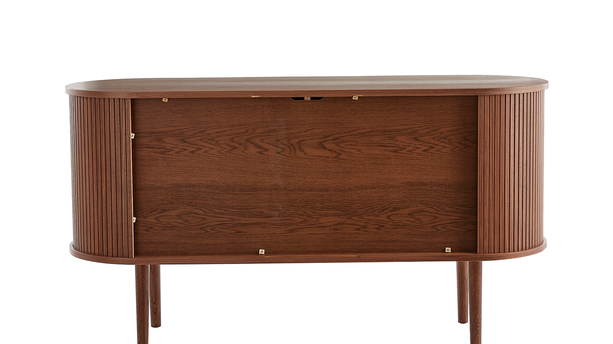 Supporté par un solide piètement en chêne massif, le robuste caisson en panneaux de fibres de bois placage noyer se compose de six compartiments. Quatre niches centrales (L48.1 x P36.6 x H21.3 cm) et deux niches latérales convexes (R22.5 x P36.6 x H48 cm) qui accueilleront volontiers de la vaisselle, du linge de maison, des documents ou des livres.