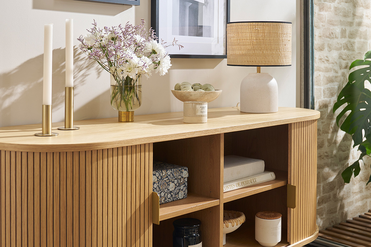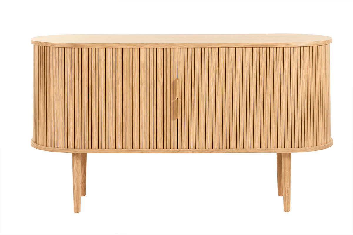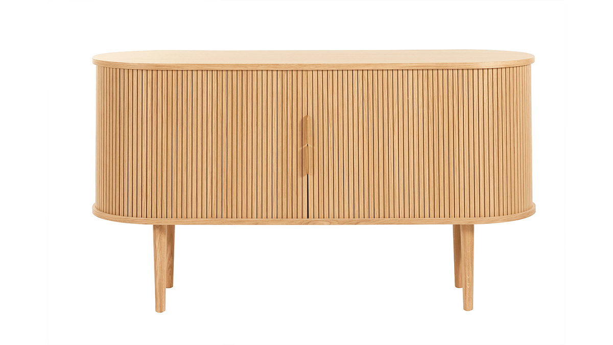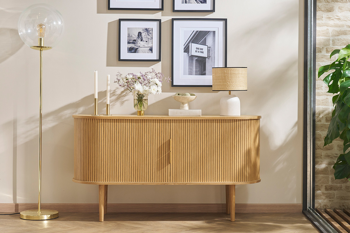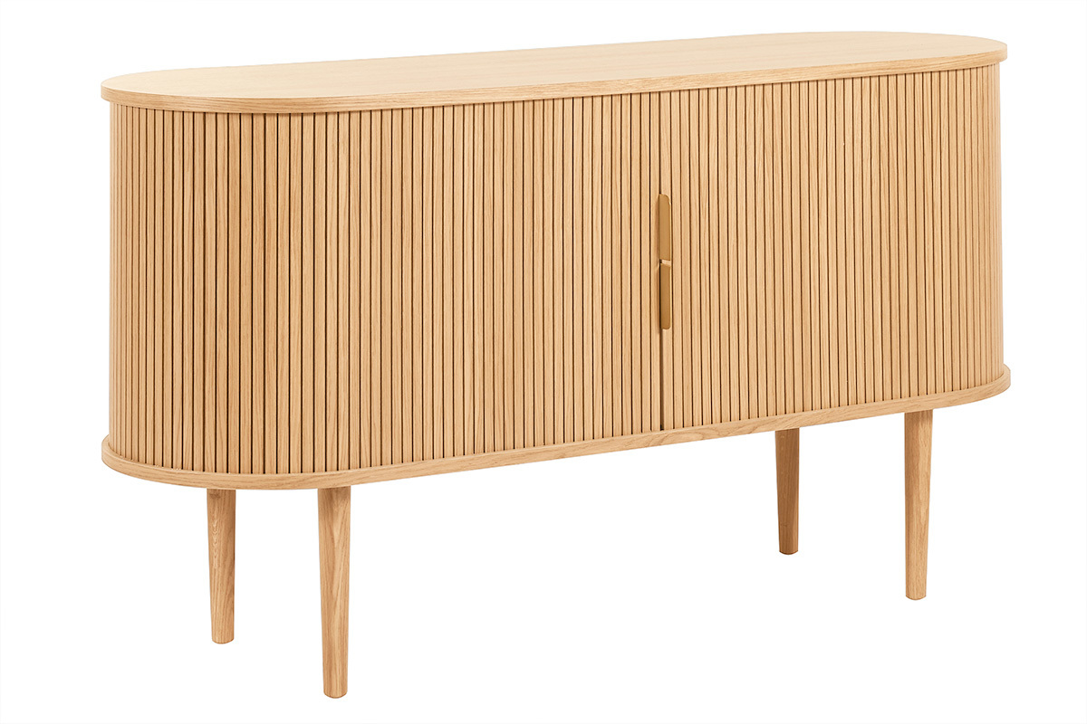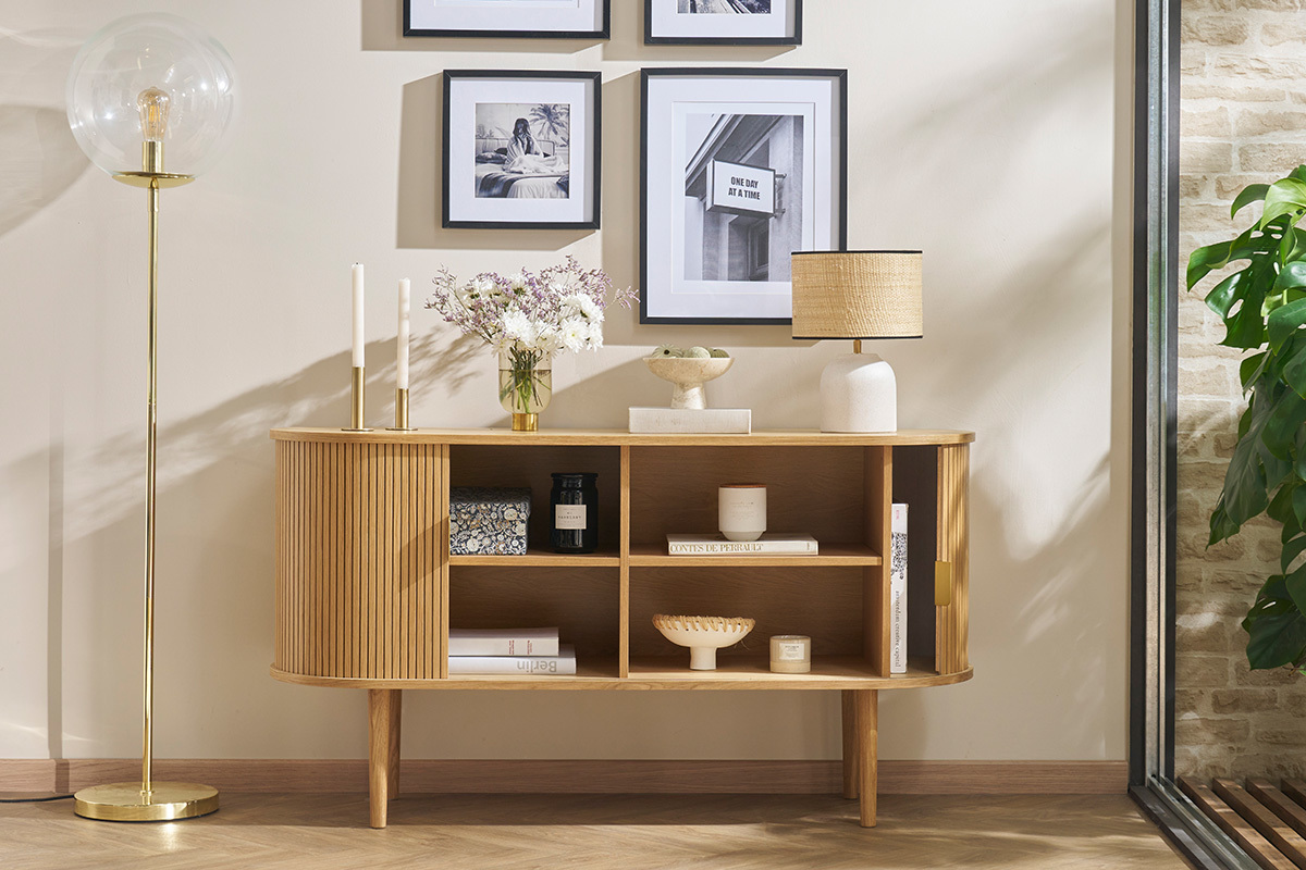 Forme oblongue, pieds hauts et légèrement fuselés, portes rideaux coulissantes en lattes de bois, détail minimaliste des poignées dorées... Question esthétique, ce buffet design n'a rien à envier aux plus grands !