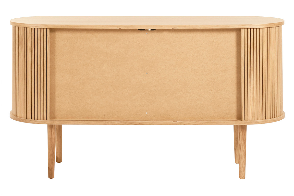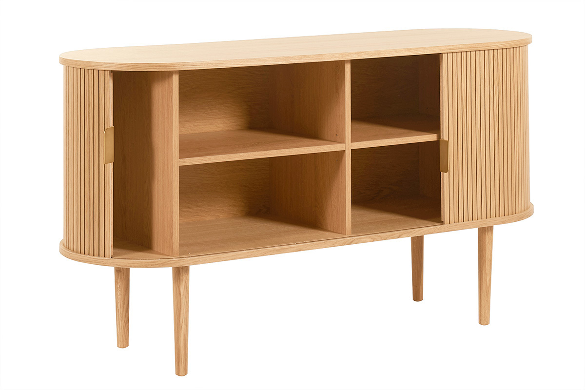 Supporté par un solide piètement en chêne massif, le robuste caisson en panneaux de fibres de bois placage chêne se compose de six compartiments. Quatre niches centrales (L48.1 x P36.6 x H21.3 cm) et deux niches latérales convexes (R22.5 x P36.6 x H48 cm) qui accueilleront volontiers de la vaisselle, du linge de maison, des documents ou des livres.