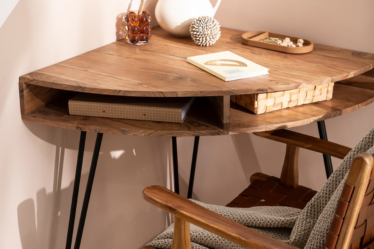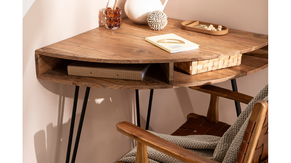 Les tons chaleureux emblématiques de l'acacia permettent à ce bureau d'instaurer une touche très cosy dans la pièce. Grâce à cette essence de bois au charme intemporel, ce bureau d'angle s'accorde simplement avec le reste du mobilier.