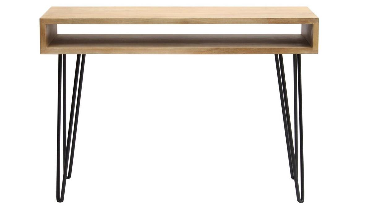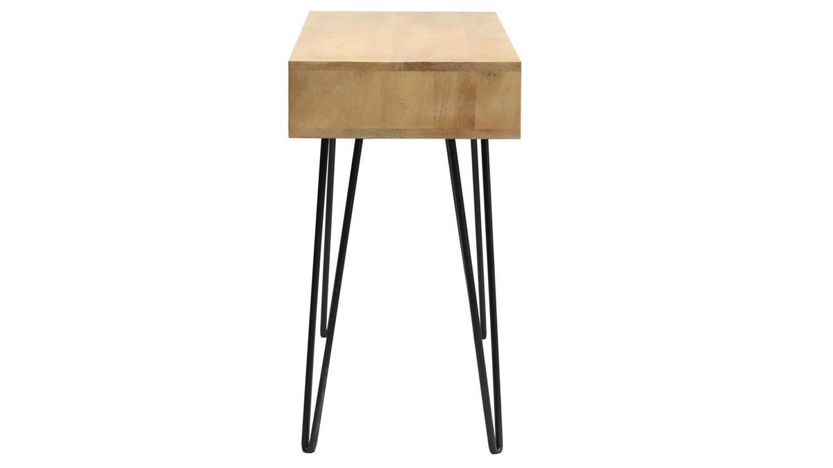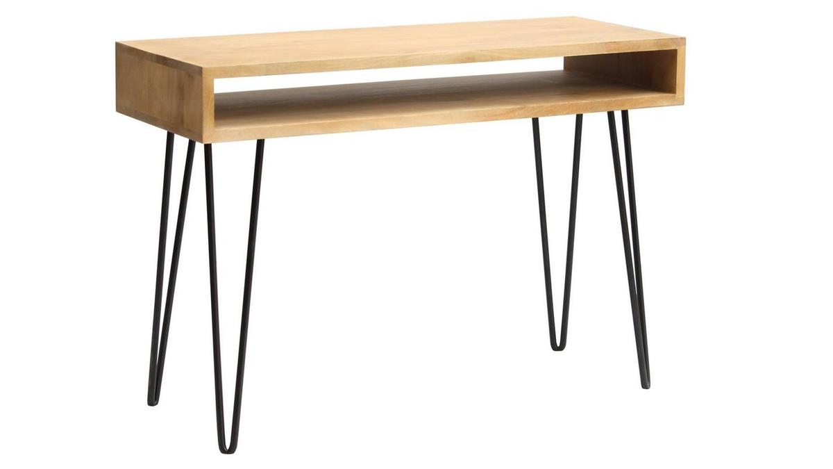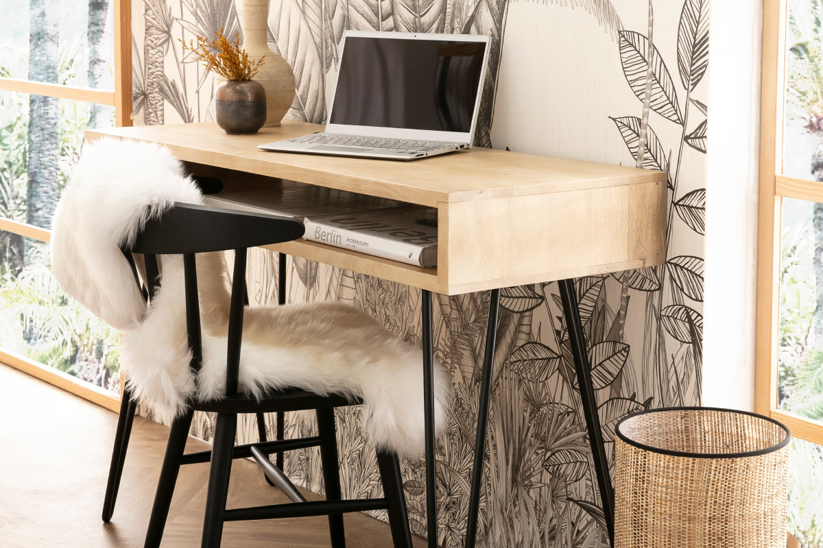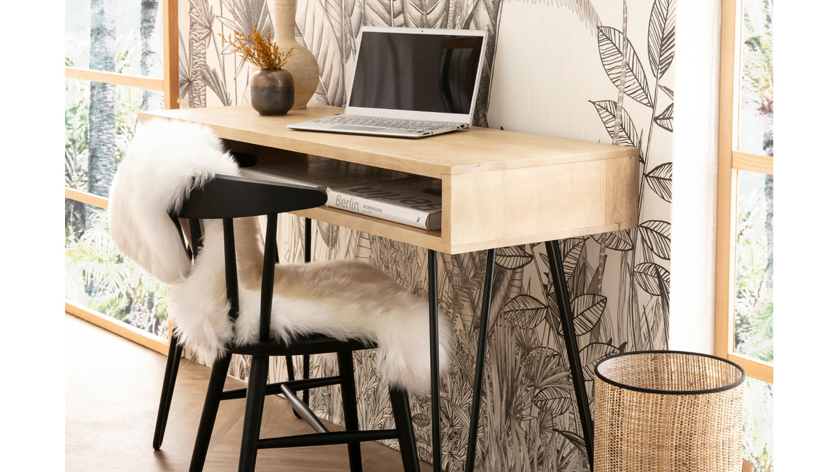 Ce bureau design en bois avec rangement se compose d'un double plateau (L116 cm) en manguier massif et d'un piètement en épingle noir. On aime particulièrement le charme authentique du manguier massif. Ce bois exotique au grain si particulier réchauffera n'importe quel intérieur.