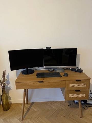 Ce bureau en bois se distingue par ses trois tiroirs spacieux, dont deux ornés de cannage en rotin, apportant une touche d'authenticité et d'originalité à la pièce. Le cannage en rotin naturel, à la fois tendance et intemporel, confère à ce bureau une allure unique tout en offrant une solution pratique de rangement. Ces tiroirs permettent de ranger facilement vos fournitures, documents ou tout autre objet du quotidien, assurant ainsi un espace de travail organisé et fonctionnel.