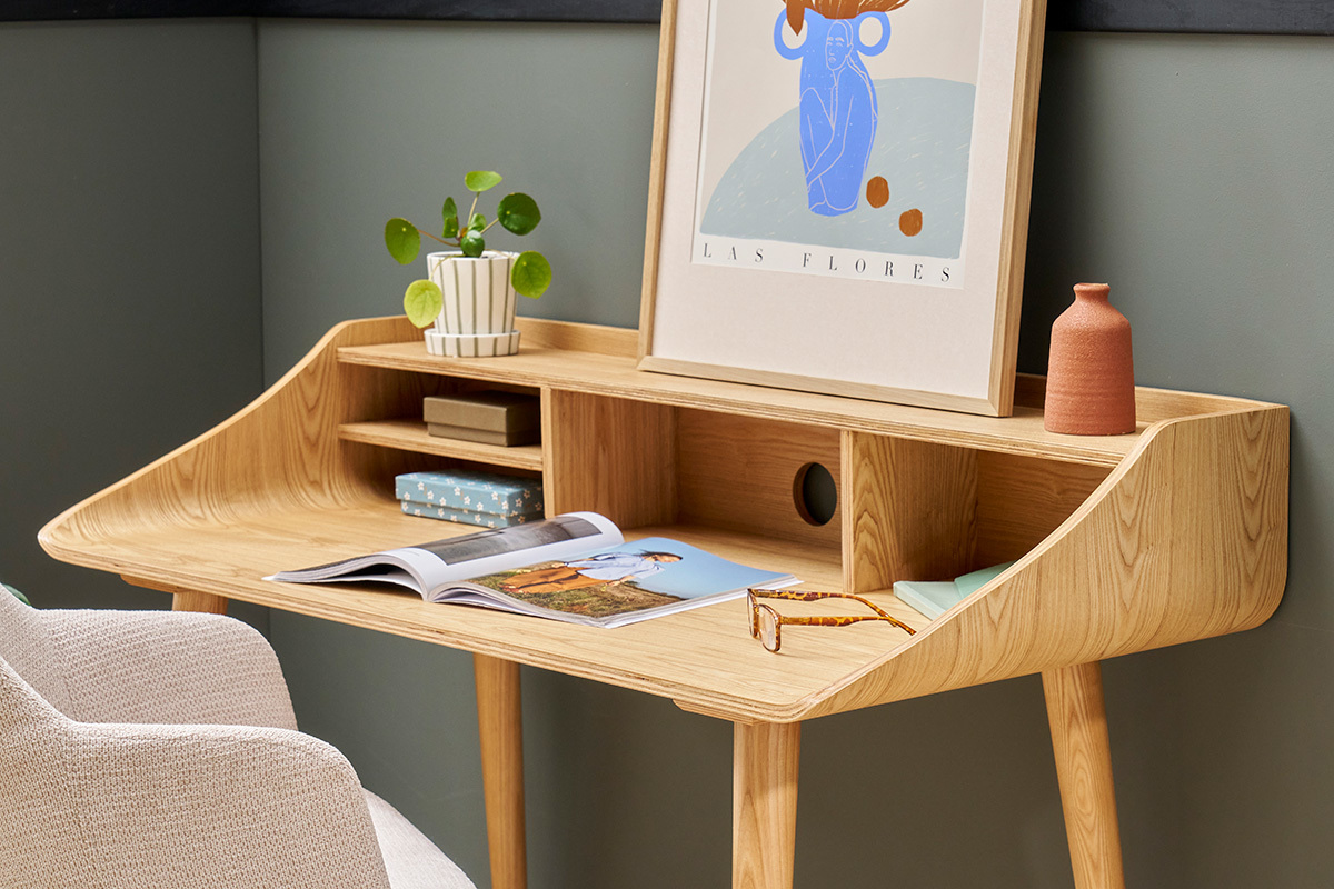 Découvrez le bureau vintage finition en frêne NORDECO ! Son design sobre et épuré permet de l'intégrer dans un intérieur moderne, scandinave ou vintage.