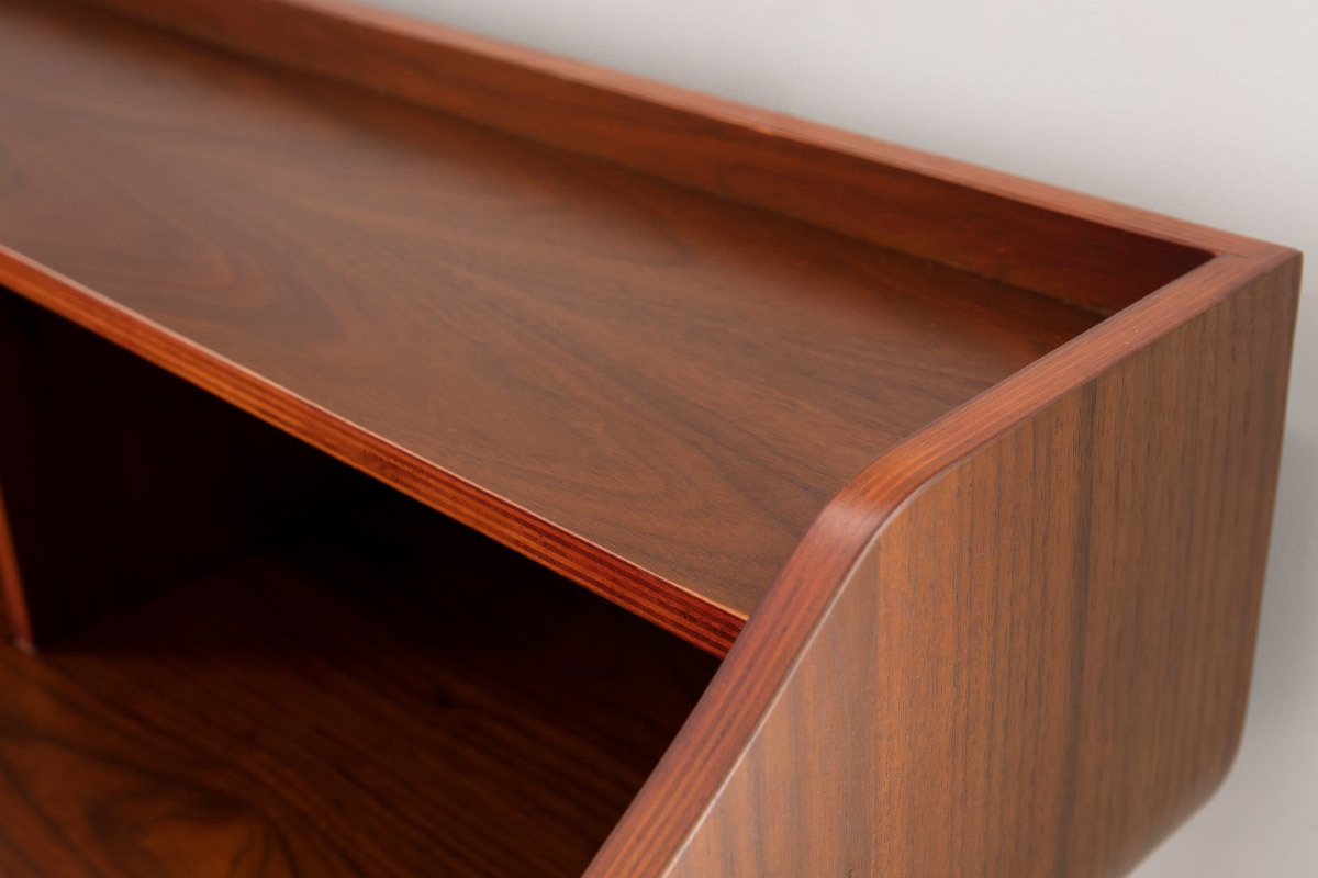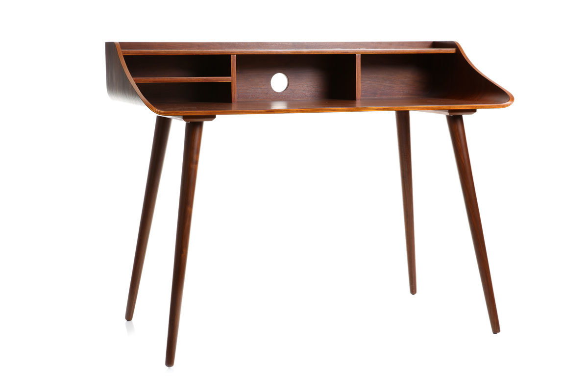 Ce bureau vintage en bois multiplis et placage en noyer possède différents espaces de rangement pour vos dossiers. De part sa taille et son style, il s'intégrera facilement dans toutes les pièces de votre maison, que ce soit dans votre salon, votre chambre ou votre bureau.