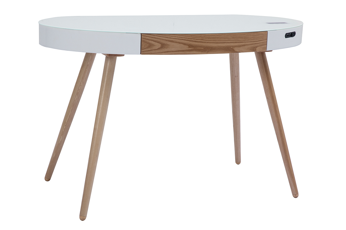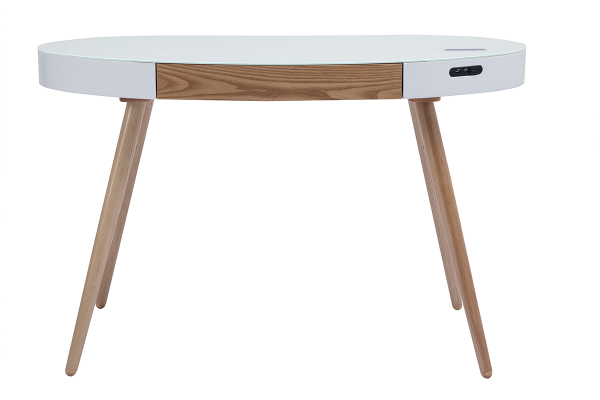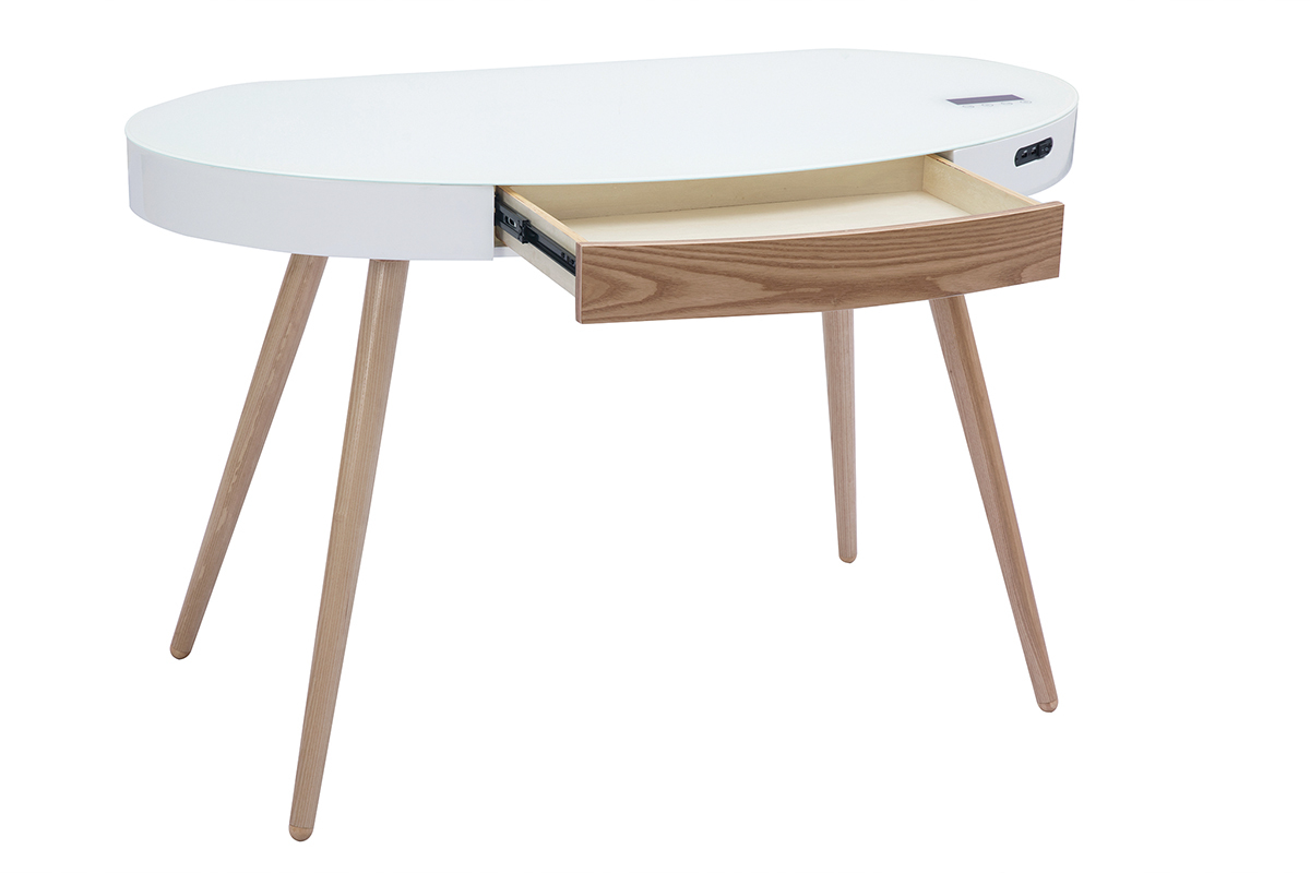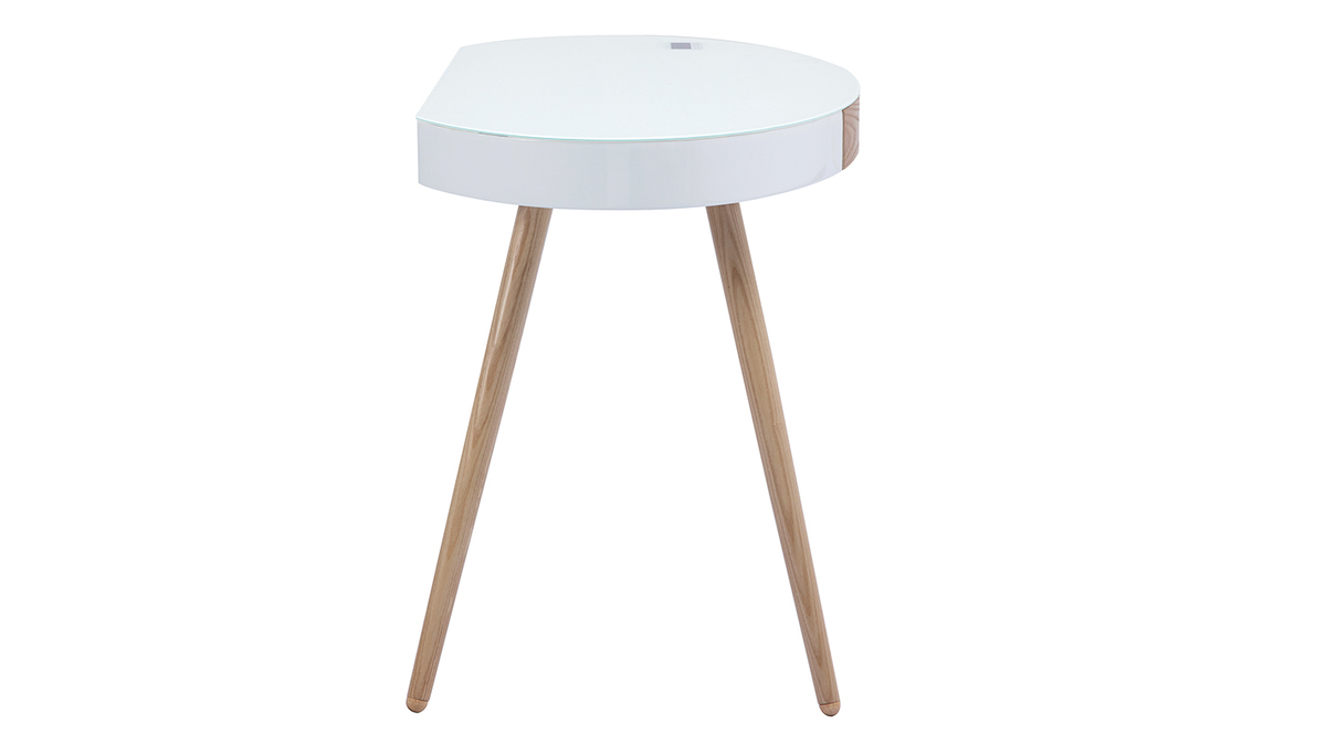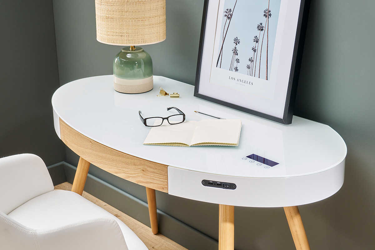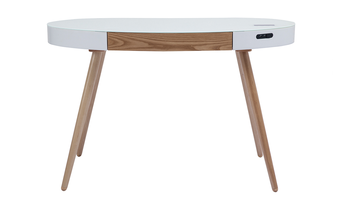 Ce bureau blanc et bois clair dispose de deux prises USB, grâce auxquelles vous pourrez recharger vos différents appareils. Ce bureau équipé du bluetooth permet d'envoyer de l'audio depuis tablette, ordinateur ou smartphone. Les enceintes intégrées, avec volume réglable diffusent un son d'une belle clarté, au-delà de ce que propose un ordinateur en termes de qualité sonore. L'interface tactile, directement insérée sur le plateau du bureau, vous permettra ainsi d'augmenter ou de baisser le volume, passer à la chanson suivante ou bien mettre en pause la lecture d'une piste.