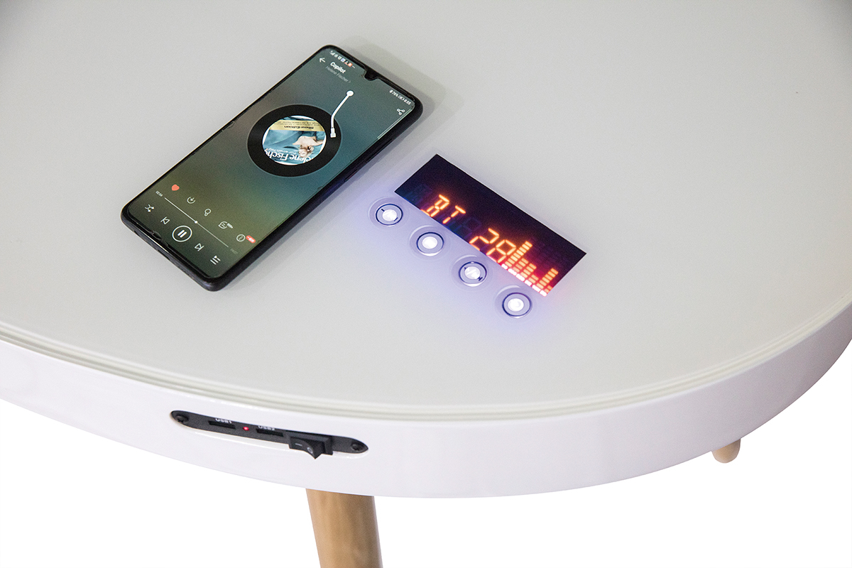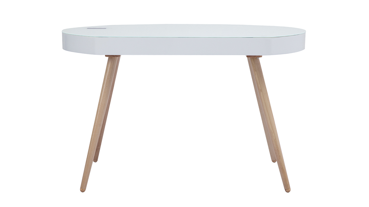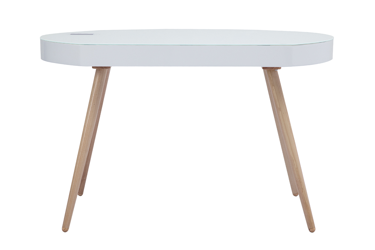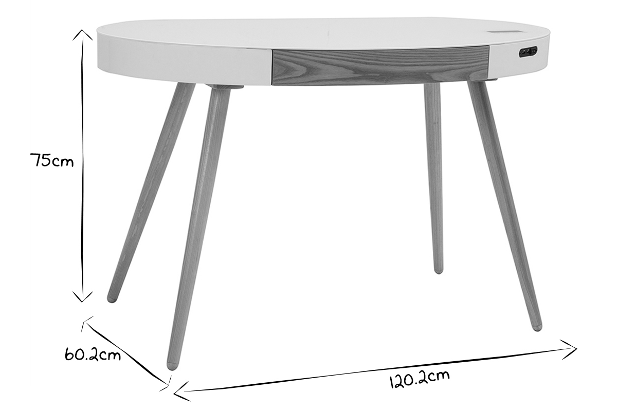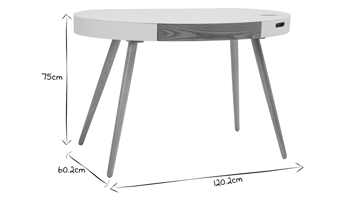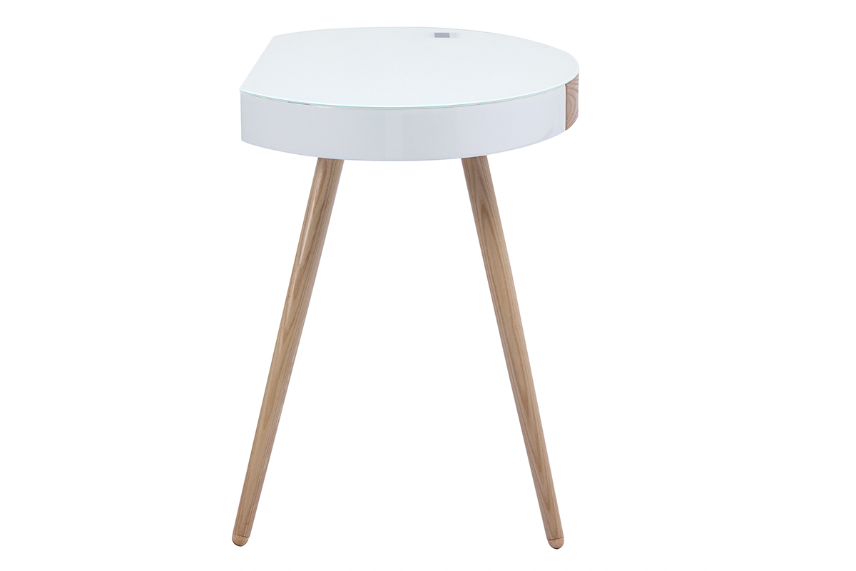 Ce bureau blanc et bois clair dispose de deux prises USB, grâce auxquelles vous pourrez recharger vos différents appareils. Ce bureau équipé du bluetooth permet d'envoyer de l'audio depuis tablette, ordinateur ou smartphone. Les enceintes intégrées, avec volume réglable diffusent un son d'une belle clarté, au-delà de ce que propose un ordinateur en termes de qualité sonore. L'interface tactile, directement insérée sur le plateau du bureau, vous permettra ainsi d'augmenter ou de baisser le volume, passer à la chanson suivante ou bien mettre en pause la lecture d'une piste.