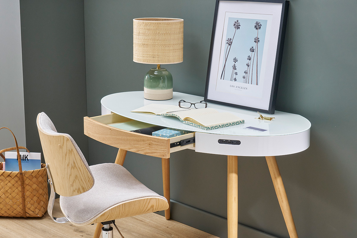 Côté esthétisme, ce bureau connecté design blanc et bois clair n'est pas en reste ! Pour faire d'HANDY une pièce de mobilier aussi pratique que décorative, le plateau en verre trempé est associé à une structure en panneaux de fibres de bois et des pieds en bois (frêne massif). Pour compléter l'ensemble, un large tiroir vous permettra de ranger tous vos accessoires de travail. I