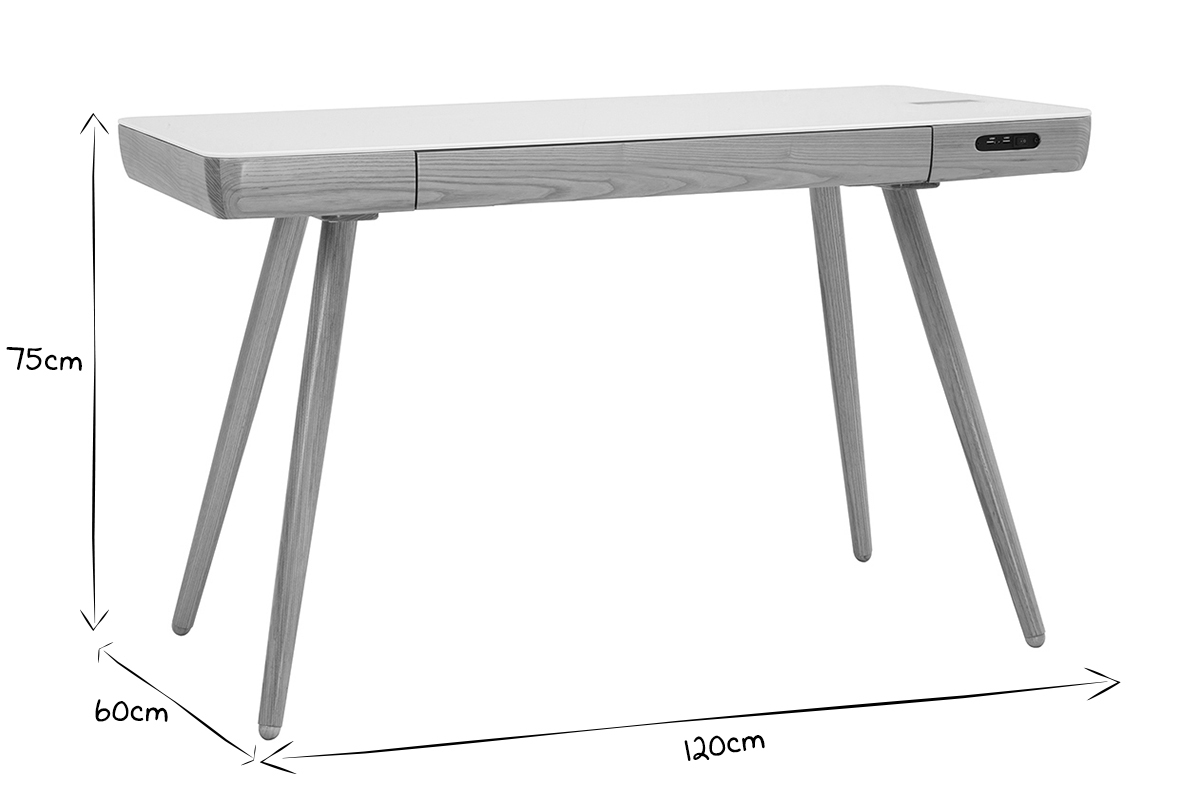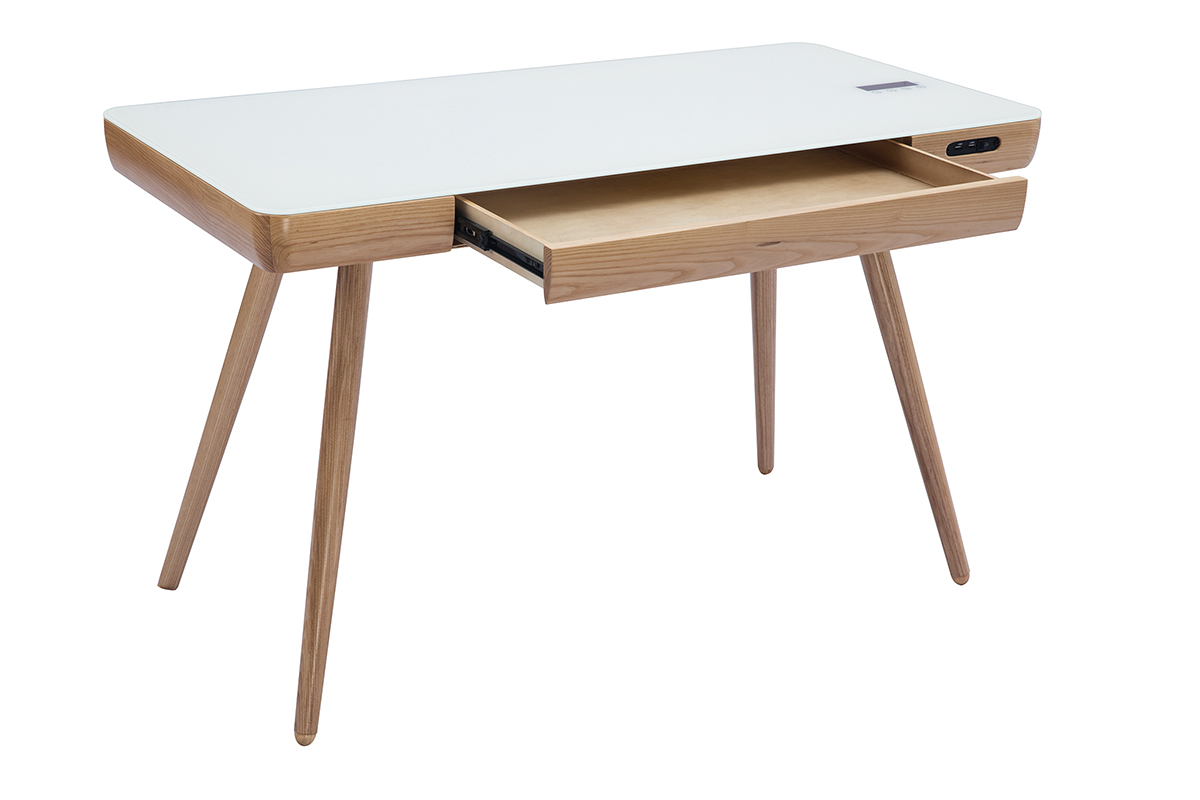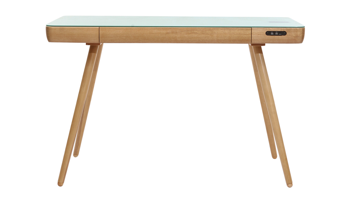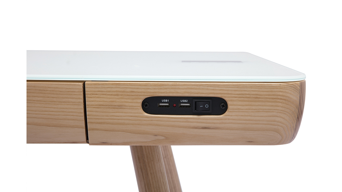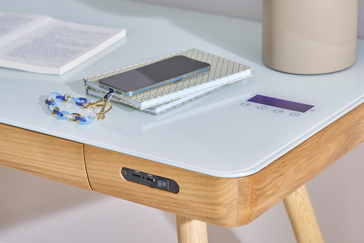 Comme nous aimons le design autant que la facilité d'utilisation de nos meubles, le bureau connecté multimédia CLEVER ne déroge pas à la règle. Son plateau est en verre tandis que ses pieds et sa structure sont en frêne. Un large tiroir vous permettra de ranger tous vos accessoires de travail.