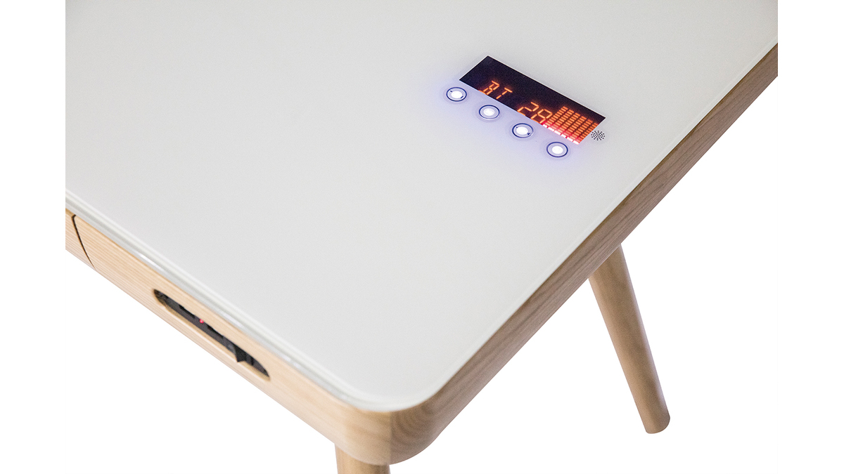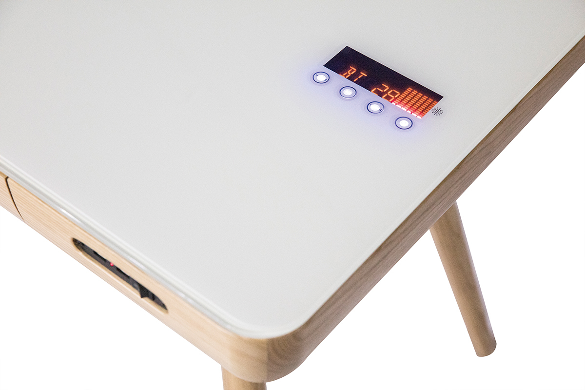 De plus, des enceintes sont intégrées au bureau. Le son est d'une qualité excellente et vous vous pouvez régler le volume, changer de chanson, mettre la piste en pause depuis l'interface tactile intégré au plateau. L'enceinte est accessible par bluetooth afin de pouvoir envoyer de l'audio directement depuis une tablette, un ordinateur ou un smartphone.