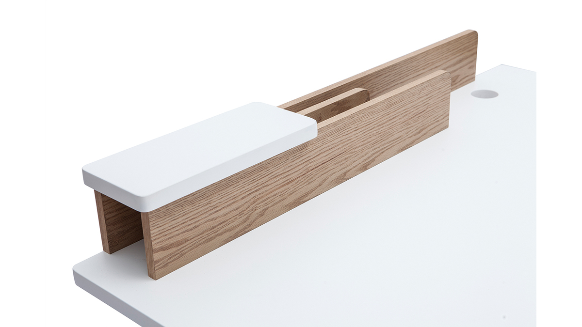 Qui n'a jamais rêvé d'avoir une grande surface pour travailler ? J'ai dessiné le bureau TOGARY de façon à ce que son plateau soit toujours dégagé : des livres disposés verticalement, une petite étagère, des rangements discrets. Tout en étant rangé, le matériel reste à portée de main, pour travailler de manière efficace.