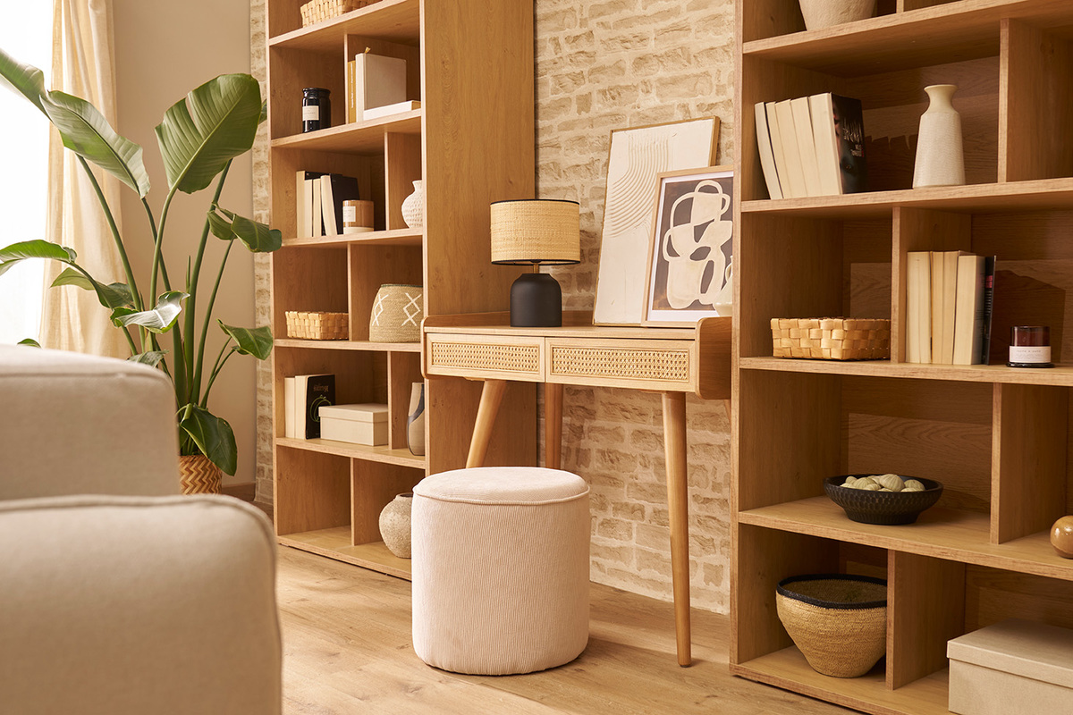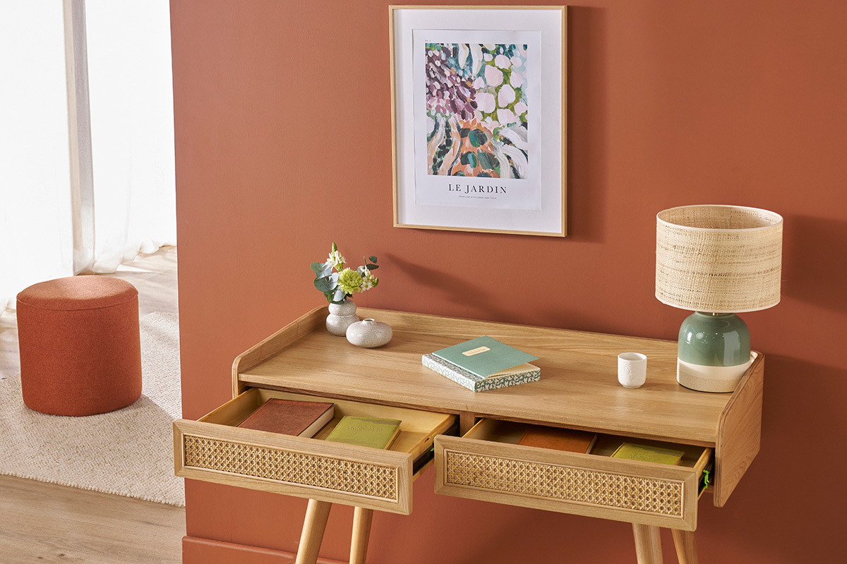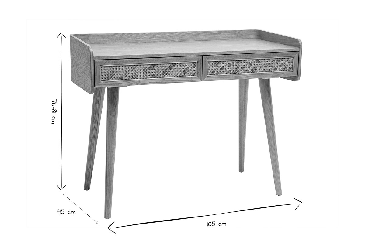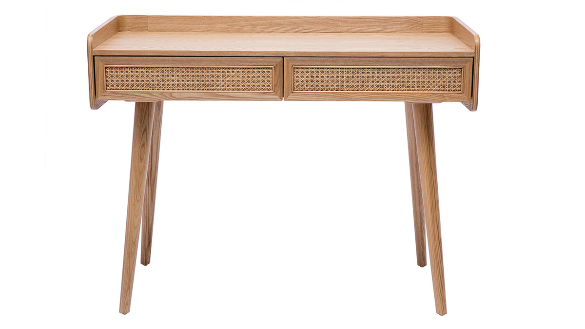 Le bois clair (plaquage d'eucalyptus), chaleureux et lumineux, s'associe parfaitement avec le cannage en rotin qui orne les deux tiroirs, ajoutant une texture naturelle et authentique à l'ensemble. Le design du bureau combine fonctionnalité et esthétique, avec ses deux tiroirs spacieux permettant de ranger vos fournitures de bureau et vos accessoires tout en gardant votre espace de travail organisé.