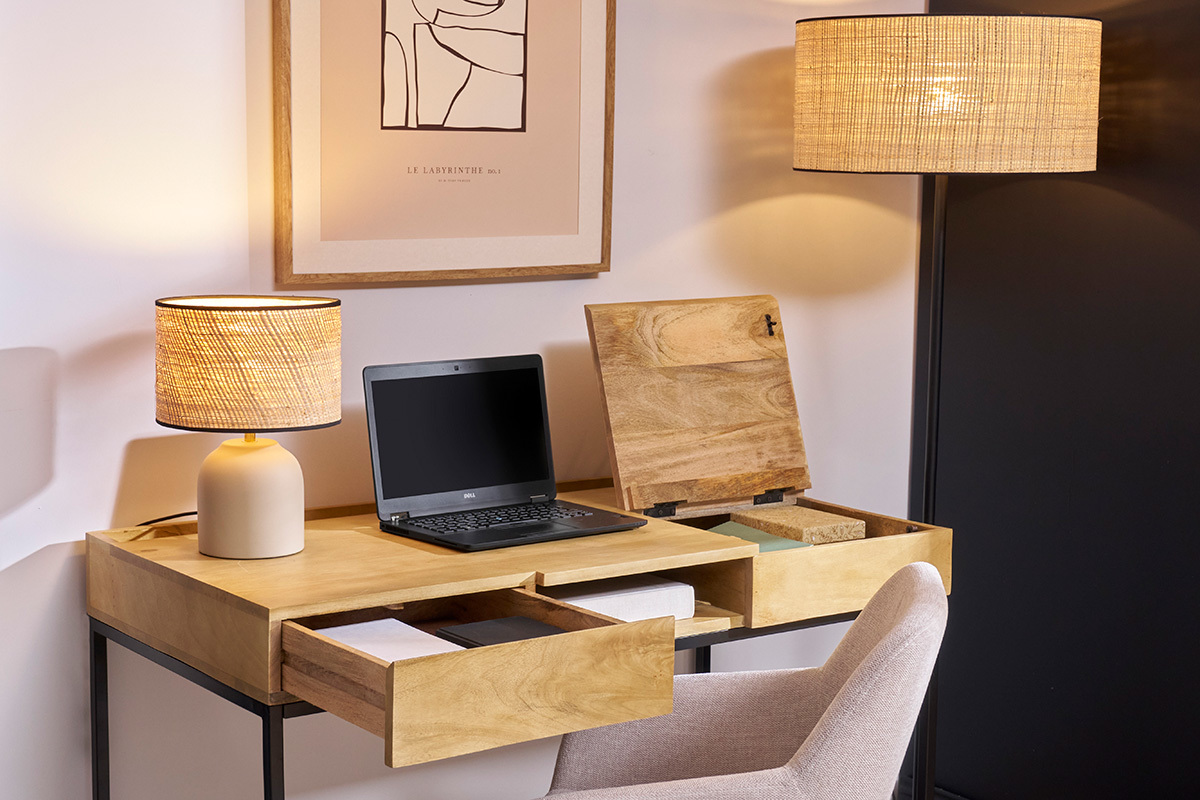 Fonctionnel, ce bureau dispose d'un tiroir de rangement, d'un caisson protégé par une porte avec un système abattant et d'une niche ouverte. Il possède également un espace de rangement affiné situé sur toute la longueur du plateau. Cet espace vous permet de ranger vos stylos ou autres outils que l'on aime avoir sous la main. Ce bureau en bois massif dispose également de passe-câbles, très pratique pour vos branchements d'ordinateur.