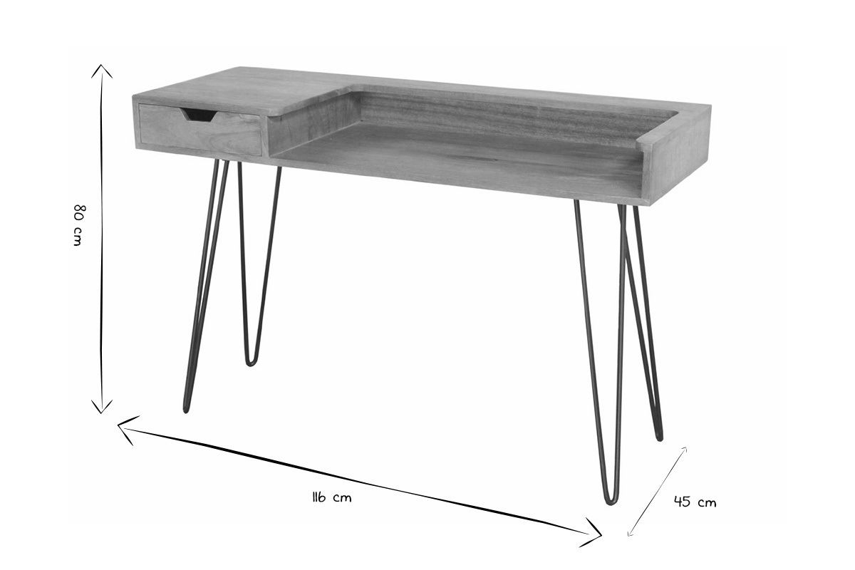 Si l'esthétique de ce bureau en bois massif a été particulièrement soignée, l'aspect pratique n'a pas été oublié. Le plateau, découpé en deux niveaux, offre une belle surface de travail compartimentée. Afin de pouvoir ranger et garder à portée de main les indispensables, le bureau en bois VIBES comprend également un tiroir. Ce meuble peut compléter un bureau industriel ou une pièce de vie ethnique chic. Le bois de manguier réchauffera la pièce et se mariera facilement avec la décoration existante. Pour un maximum de confort et de style, accompagnez-le du fauteuil de bureau design bois et noir WALNUT.