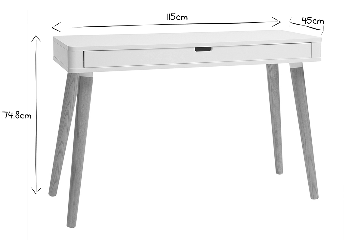Ce bureau avec rangement aux dimensions L115 x P45 x H75 cm est équipé d'un grand tiroir pour organiser au mieux le coin travail. Ce joli petit bureau blanc sera le meuble idéal pour aménager un coin travail dans une pièce de vie partagé comme le séjour ou la chambre à coucher.